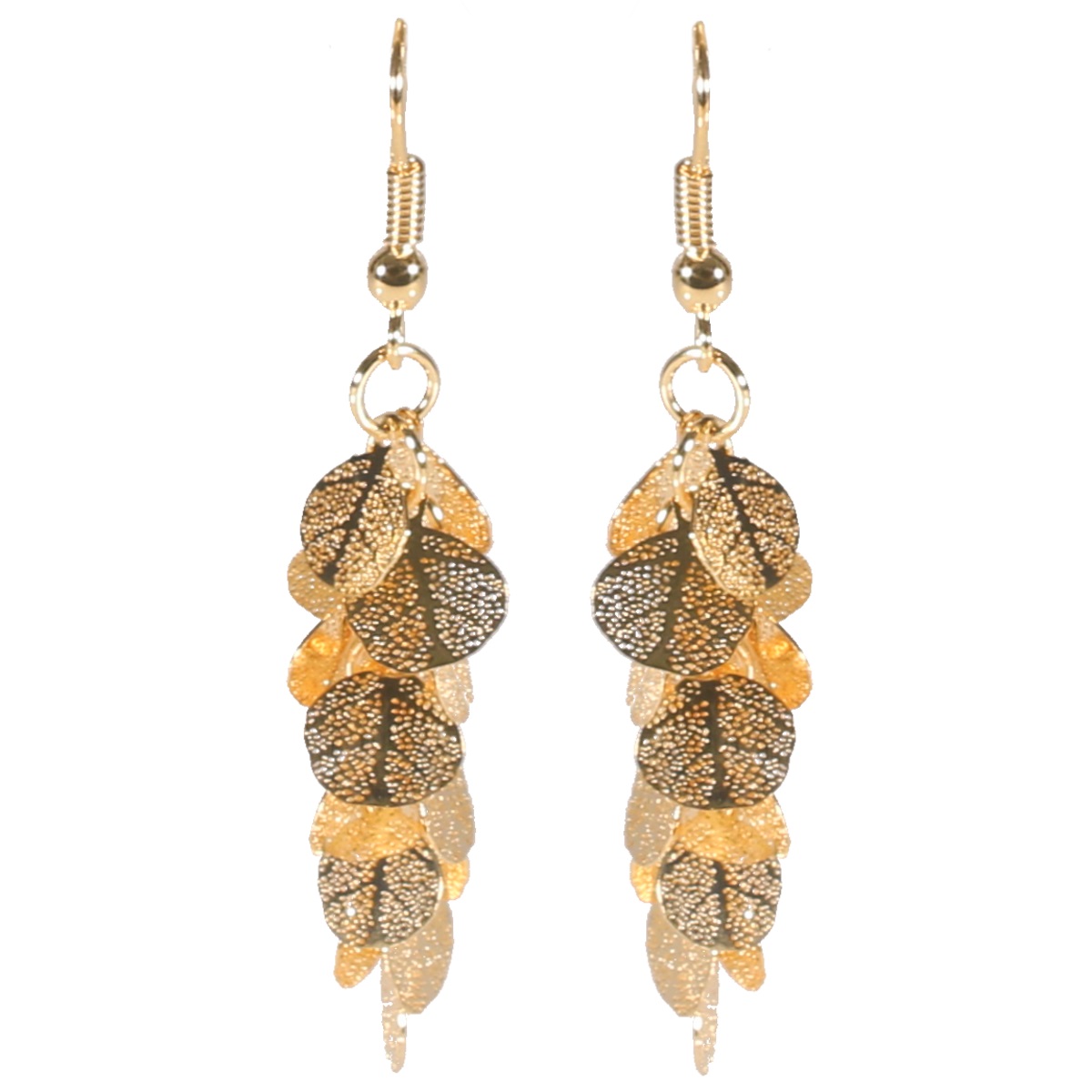 Description Boucles d'oreilles pendantes fantaisie feuilles en métal doré. Cliquez sur une matière, un thème, une couleur ou une collection pour voir tous les articles associés.
