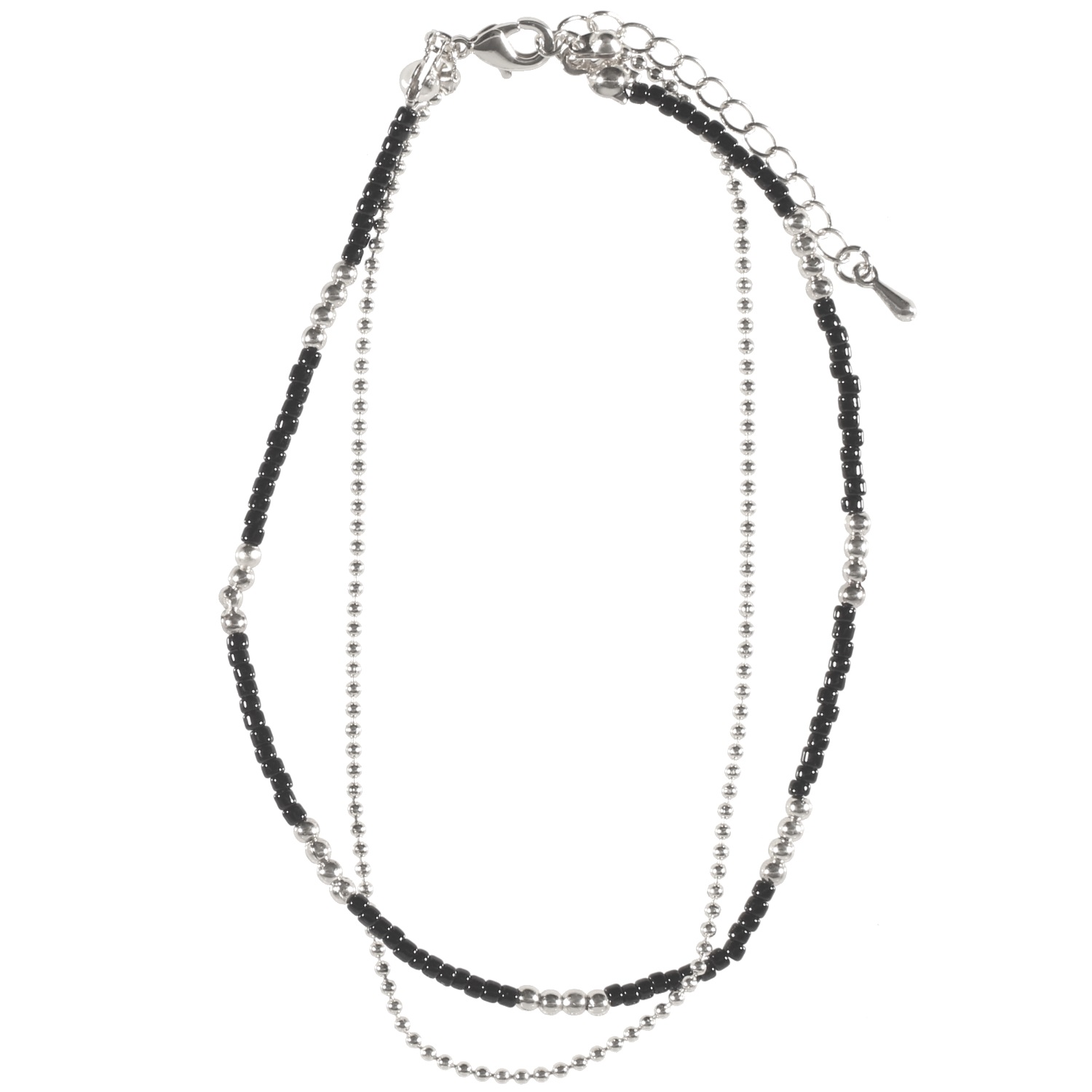 Chaîne de cheville fantaisie multi rangs en métal argenté et perles de couleur noire.<br/>2 rangs. Boule Cheville Multirangs Perle  Adolescent Adulte Femme Fille Indémodable Chaîne de cheville fantaisie multi rangs en métal argenté et perles de couleur noire.<br/>2 rangs. Boule Cheville Multirangs Perle  Adolescent Adulte Femme Fille Indémodable