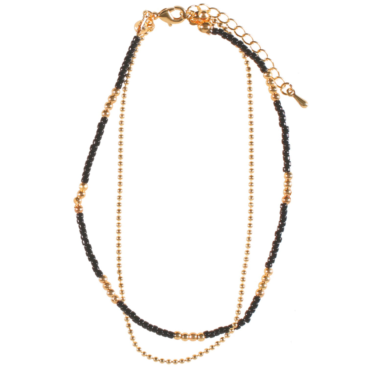 Chaîne de cheville fantaisie multi rangs en métal doré et perles de couleur noire.