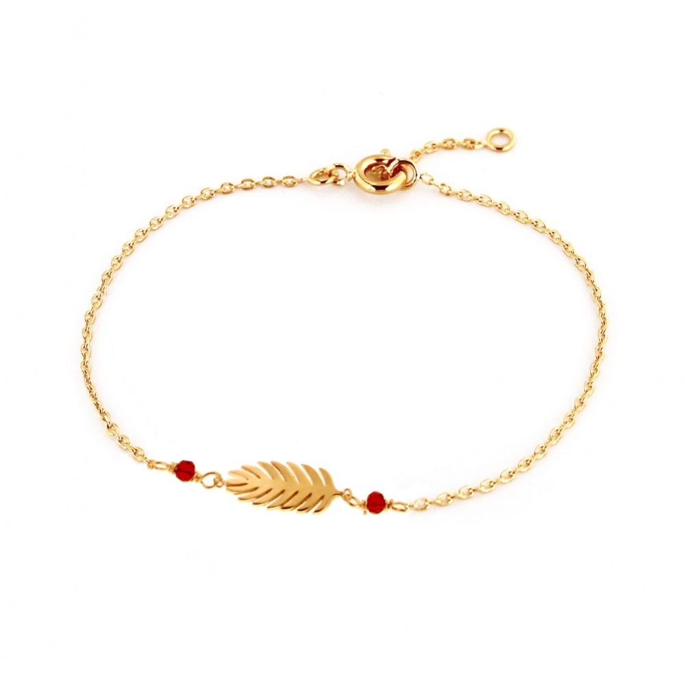 Bracelet avec feuille en plaqué or et deux perles de couleur rouge.