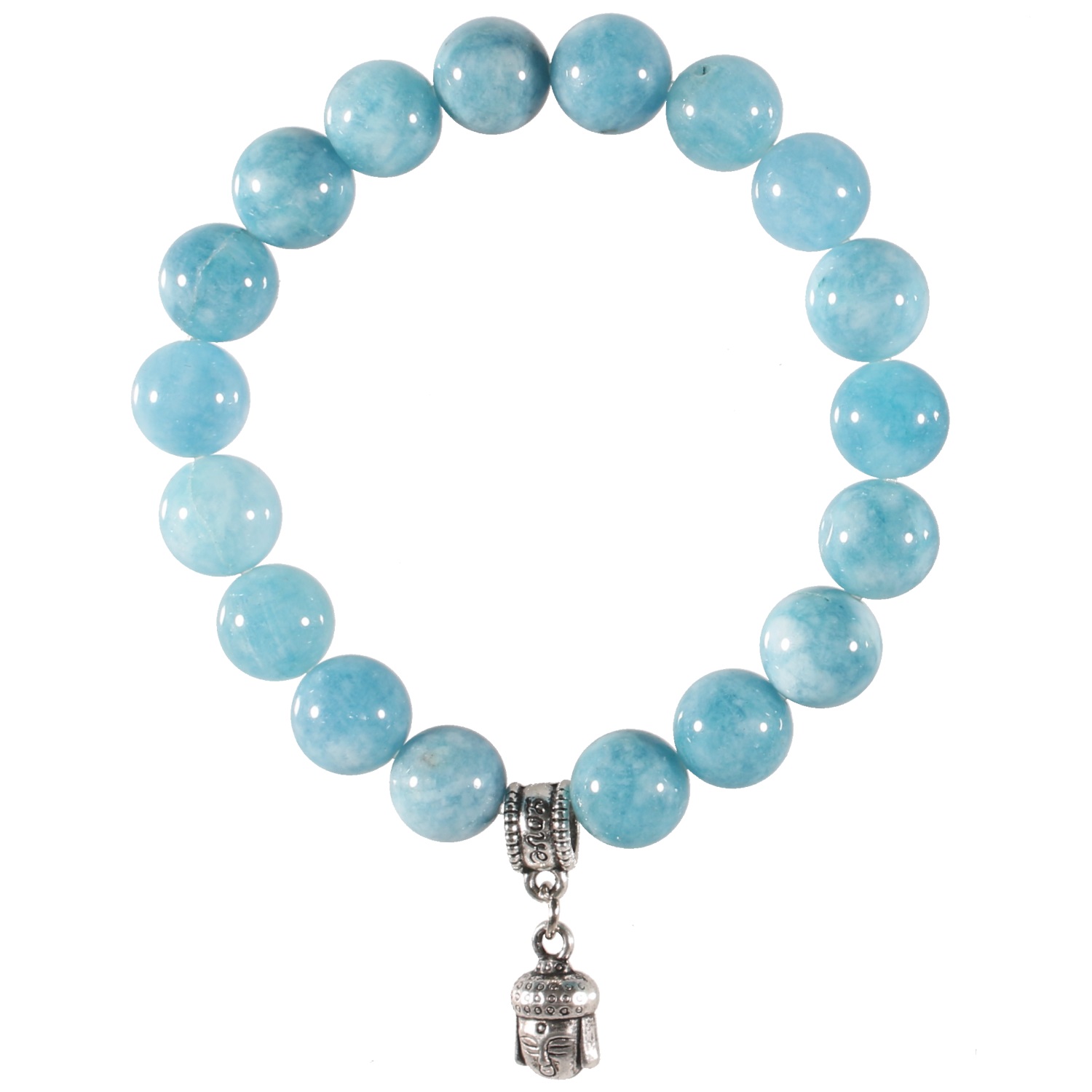 Bracelet élastique avec tête de Bouddha en métal argenté et boules en pierre quartz bleu.