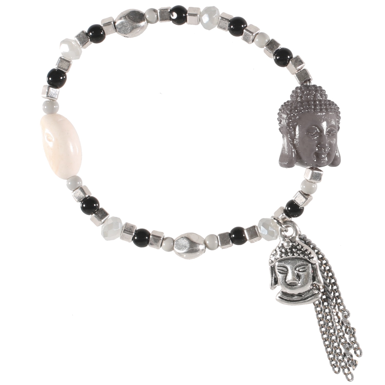Bracelet fantaisie élastique avec tête de Bouddha et perles en métal argenté, perles de couleur, pompon en métal peint, tête de Bouddha en matière synthétique et pierre naturelle.