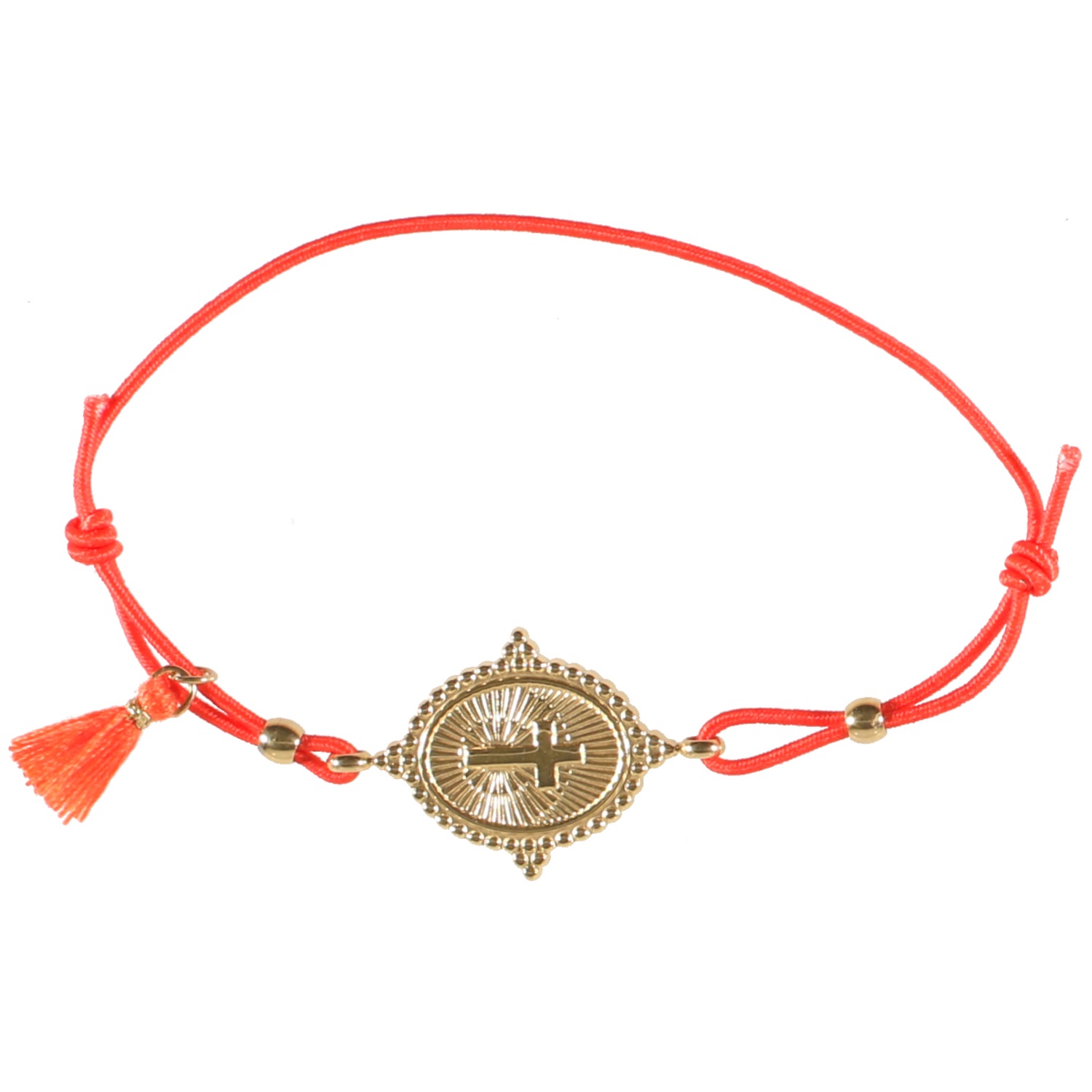 Bracelet cordon élastique en coton, pompon en textile et pastille avec croix en acier doré.