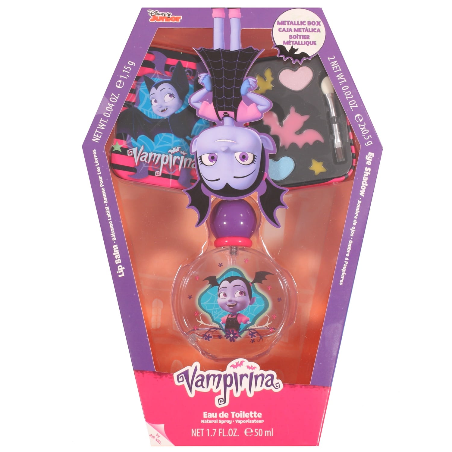 Eau de toilette Vampirina de Disney junior ainsi qu'une boîte métallique avec ombre à paupières et baume pour lèvres.