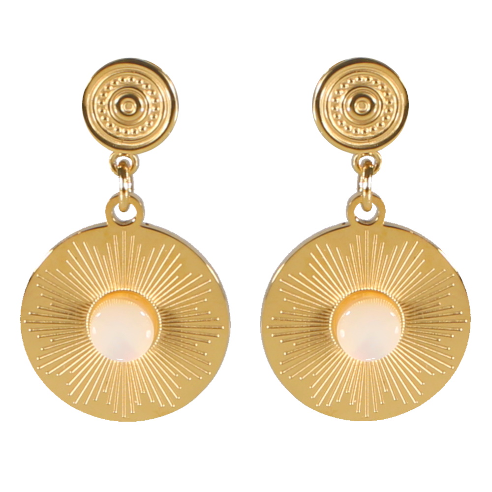Description Boucles d'oreilles pendantes composées d'une puce aux motifs en relief et d'une pastille avec motifs de rayons en acier doré surmontée d'une coquille de nacre. Largeur 16 mm Hauteur 28 mm Matière(s) Acier , Nacre . L'acier utilisé dans la bijouterie existe sous plusieurs qualités. Nous utilisons principalement la qualité 316L, qualité qui est utilisée en chirurgie. Cet acier est donc inoxydable et reste très résistant. Fermoir Tiges poussettes Couleur(s) dominante(s) Blanc , Doré Public Adolescent , Adulte . Genre Femme , Fille . Saison Indémodable . Cliquez sur une matière, un thème, une couleur ou une collection pour voir tous les articles associés.