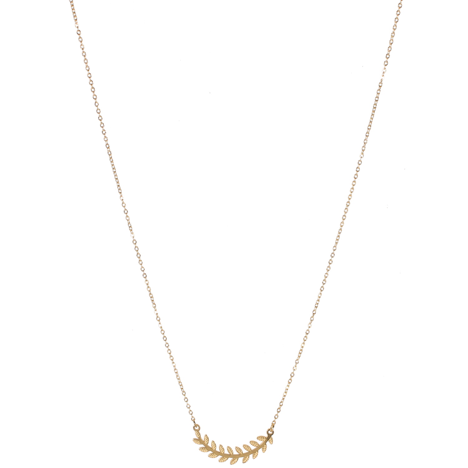 Description Collier composé d'une chaîne et d'une branche de laurier en acier doré. Fermoir mousqueton avec 7 cm de rallonge. Cliquez sur une matière, un thème, une couleur ou une collection pour voir tous les articles associés.