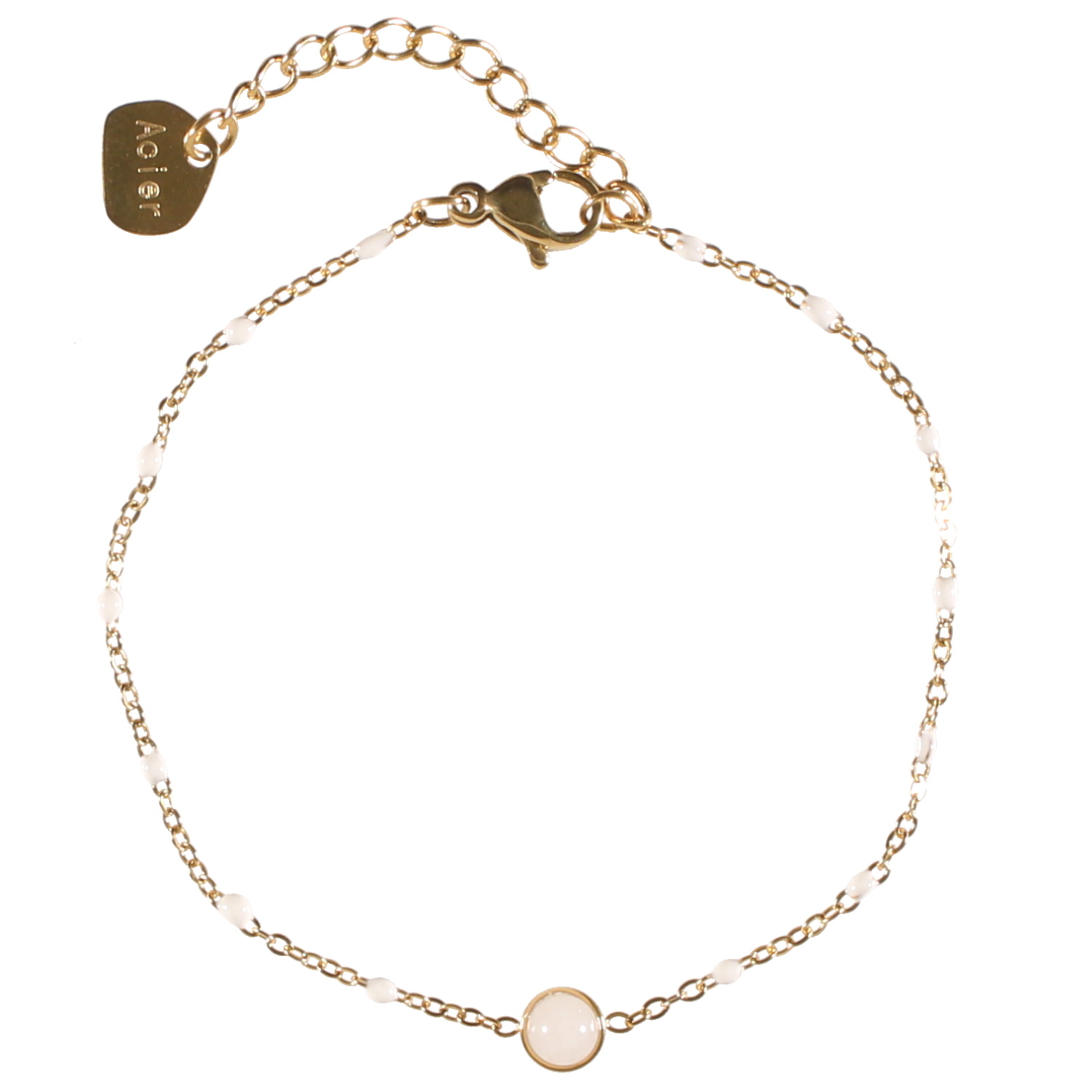 Description Bracelet composé d'une chaîne en acier doré, de perles en émail de couleur blanche et d'une véritable pierre de jade blanc sertie clos de forme ronde. Fermoir mousqueton avec 3 cm de rallonge. Cliquez sur une matière, un thème, une couleur ou une collection pour voir tous les articles associés.