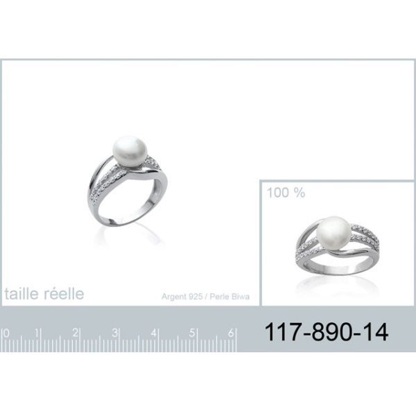 Bague en argent 925/000 rhodié, oxyde de zirconium et perle d'eau douce (BIWA).