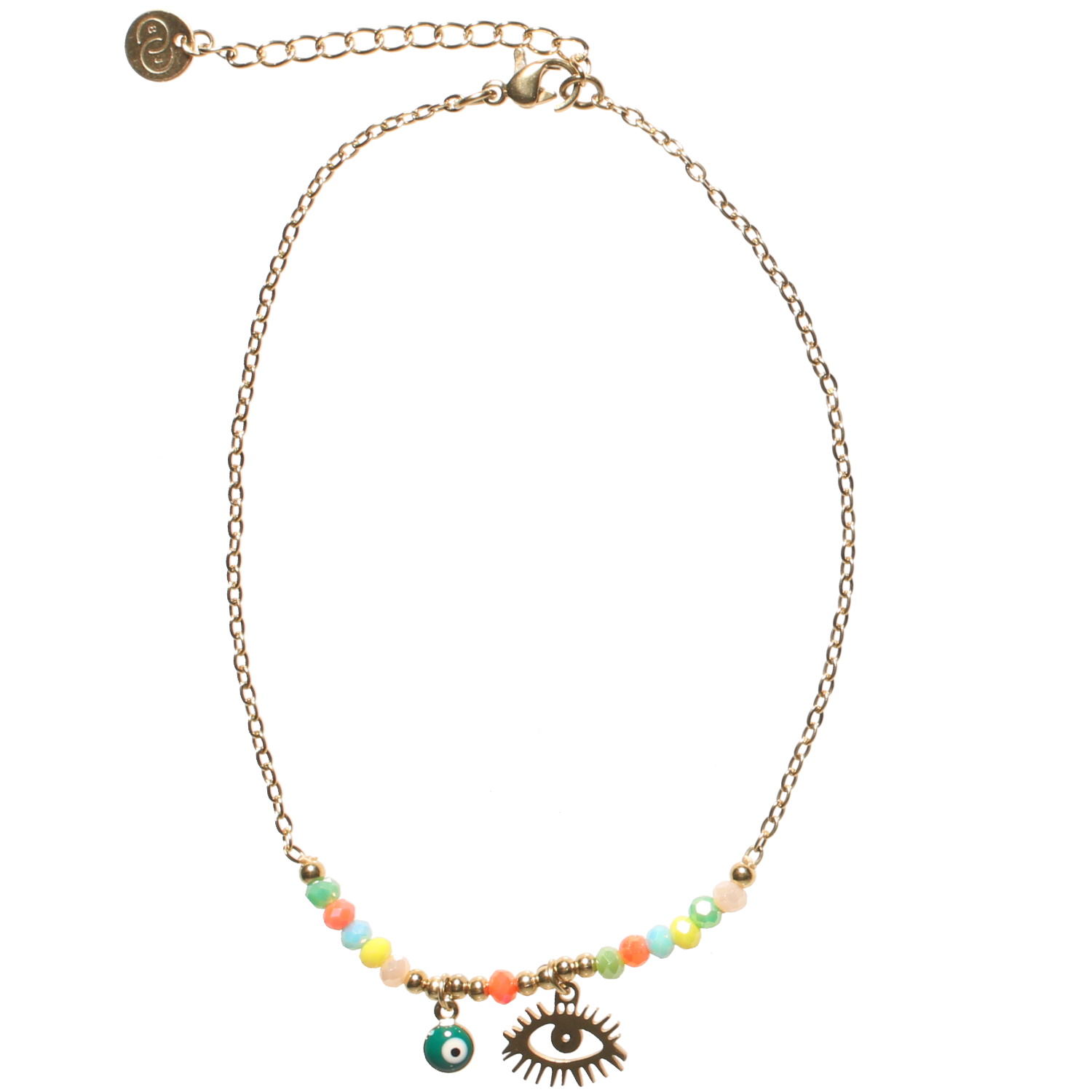 Bracelet chaîne de cheville composé d'une chaîne avec perles en acier doré, de perles multicolores, d'un pendant œil de Turquie pavé d'émail et d'un pendant œil de Turquie en acier doré.