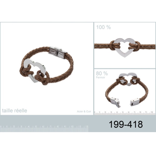 Description Bracelet en acier et cuir. Longueur 18 cm [Guide des tailles] Largeur 25 mm Matière(s) Acier , Cuir . L'acier utilisé dans la bijouterie existe sous plusieurs qualités. Nous utilisons principalement la qualité 316L, qualité qui est utilisée en chirurgie. Cet acier est donc inoxydable et reste très résistant. Fermoir Plat Couleur(s) dominante(s) Marron Public Adulte . Genre Femme . Saison Indémodable . Thème(s) Amour . Cliquez sur une matière, un thème, une couleur ou une collection pour voir tous les articles associés.