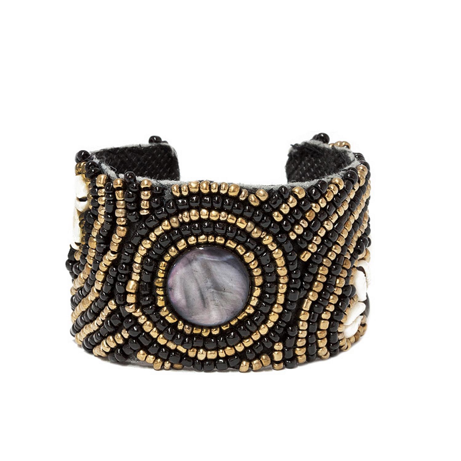 Bracelet manchette fantaisie en métal doré, coquillage, rocaille et textile.
