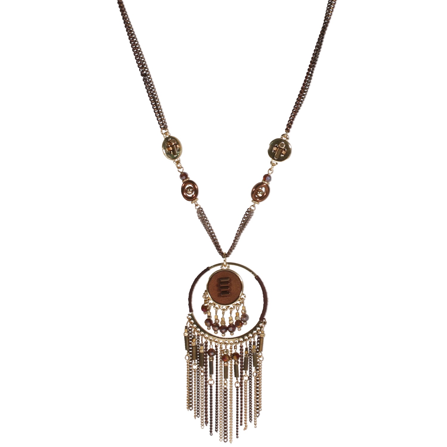 Collier fantaisie en métal doré, métal peint, suédine, rocaille et textile.
