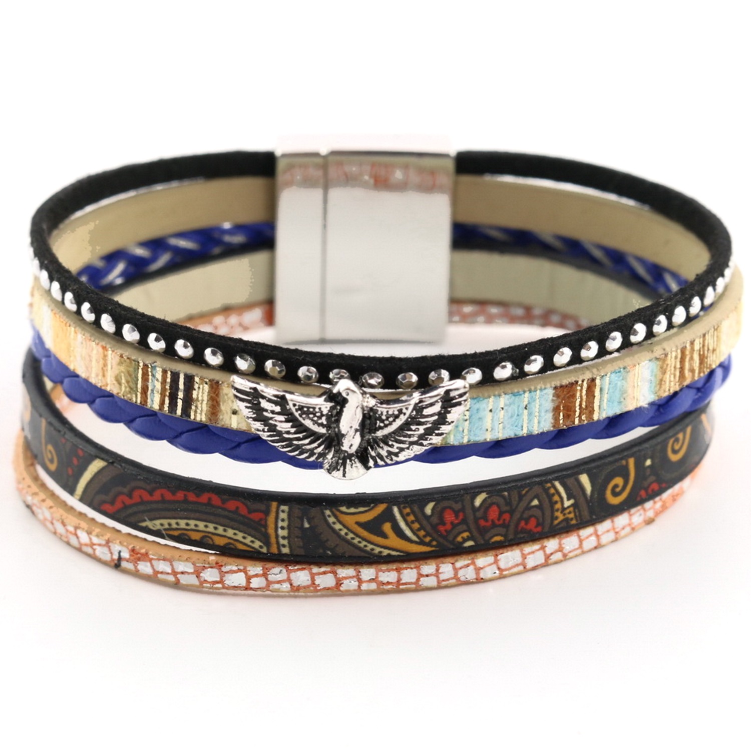 Bracelet fantaisie en métal argenté, suédine, polyuréthane et textile.