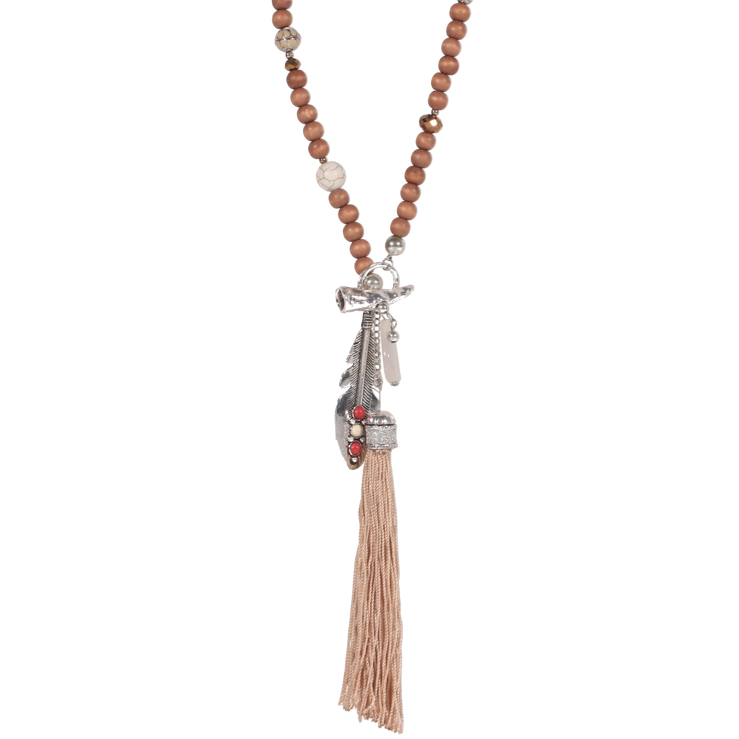 Collier sautoir fantaisie en métal argenté, métal peint, rocaille, bois et textile.