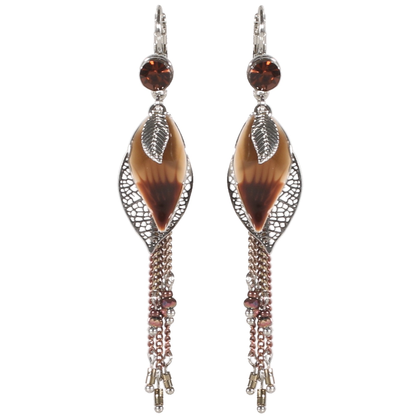 Boucles d'oreilles fantaisie pendantes Indian spirit Feuilles en métal argenté, métal peint, émail, cristaux et pierres synthétiques.