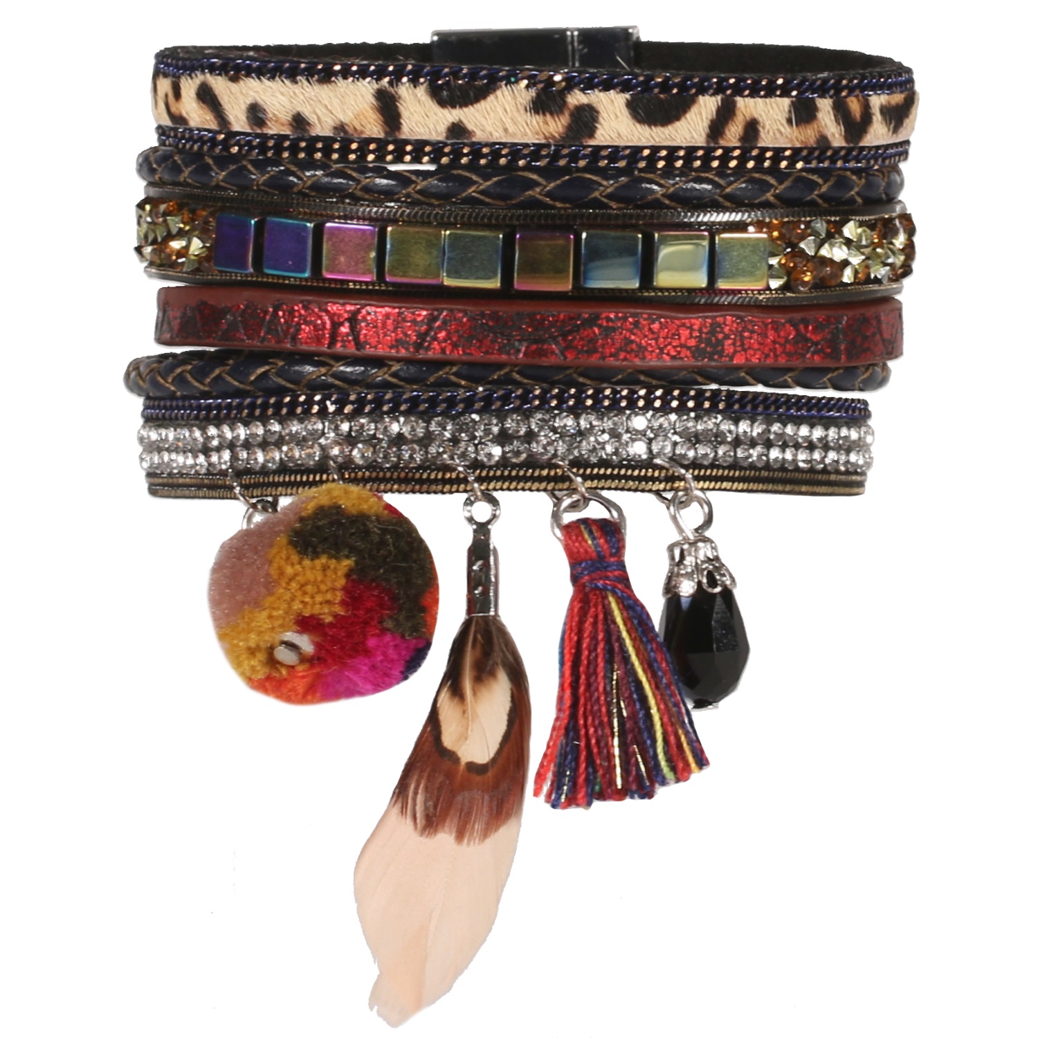 Bracelet fantaisie multi rangs Indian spirit en métal argenté, métal doré, métal peint, suédine, textile, polyuréthane, pierres et cristaux synthétiques et plume.