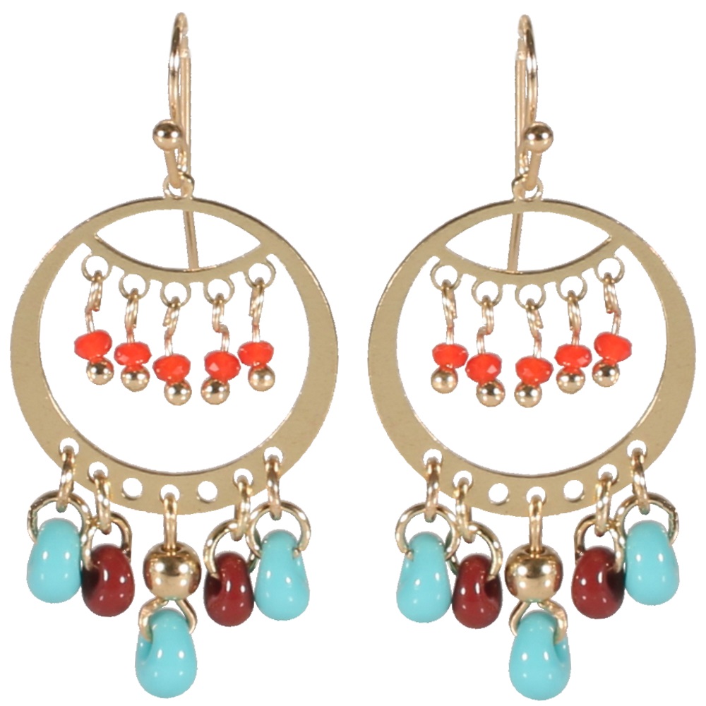 Boucles d'oreilles fantaisie pendantes en métal doré, cristaux et pierres de couleur.