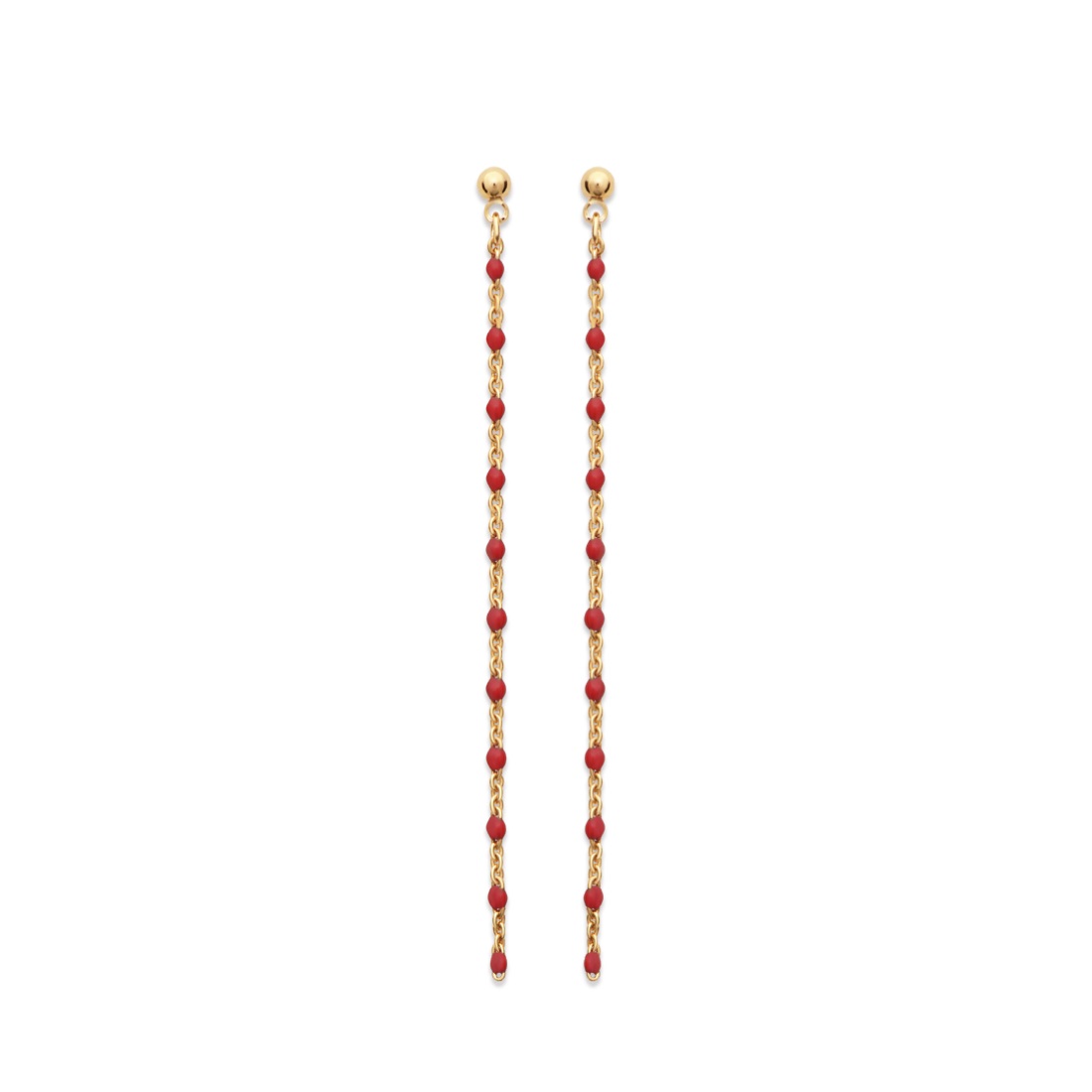 Description Boucles d'oreilles pendantes en plaqué or et perles en émail. Largeur 2 mm Hauteur 70 mm Matière(s) Email , Plaqué or . Nos bijoux en plaqué or sont faits sur une base de laiton et recouverts d'or 18 carats à 3 microns sans dispersion. Cela signifie que nous garantissons 3 microns d'or sur n'importe quelle partie du bijou. Sur la plupart de nos bijoux empierrés, nous montons à 5 microns d'or 18 carats. Pour finir, nous faisons également une finition avec de l'or 24 carats afin de donner un plus bel éclat à nos bijoux. Fermoir Tiges poussettes Couleur(s) dominante(s) Doré , Rouge Public Adolescent , Adulte . Genre Femme , Fille . Saison Indémodable . Collection Zeste d'été Cliquez sur une matière, un thème, une couleur ou une collection pour voir tous les articles associés.
