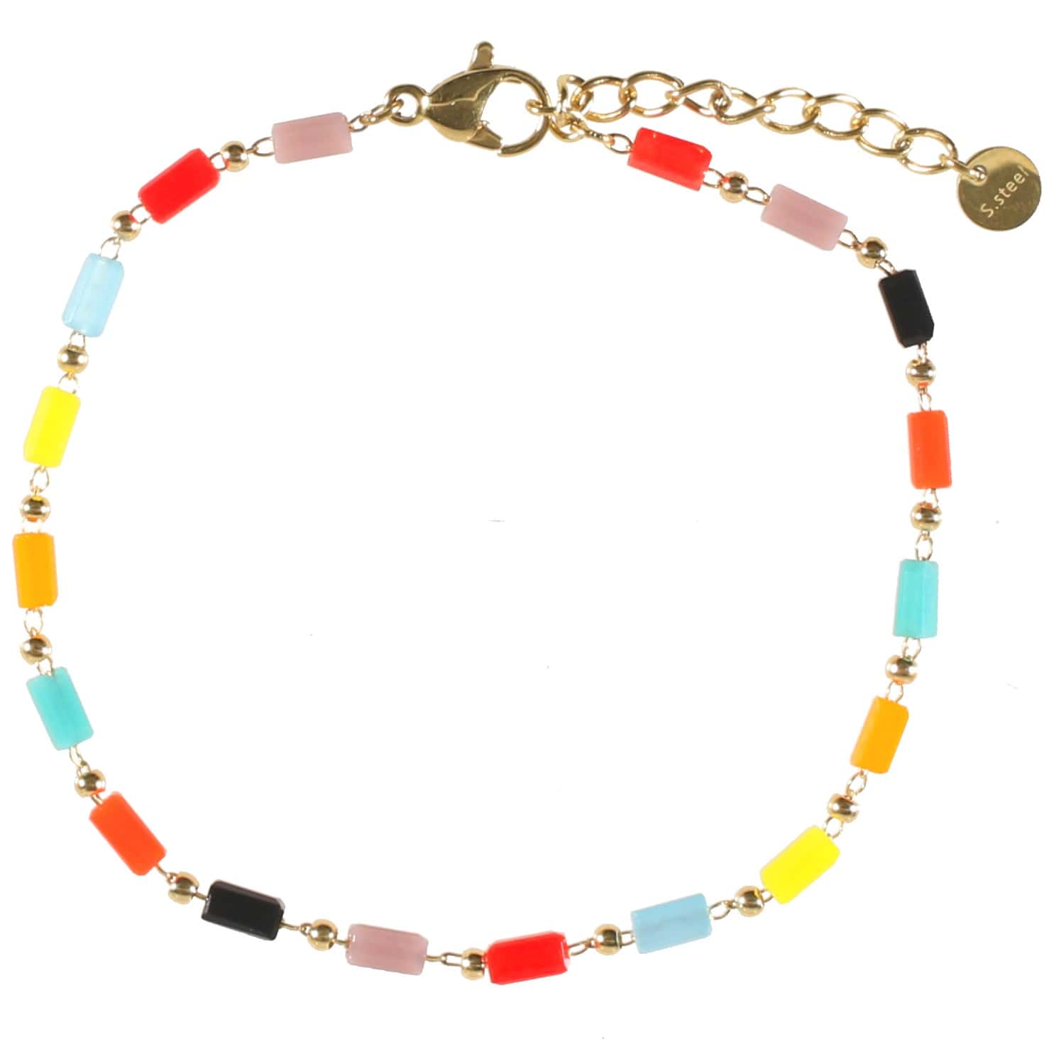 Description Bracelet en acier doré et perles de couleur rectangulaires. Cliquez sur une matière, un thème, une couleur ou une collection pour voir tous les articles associés.