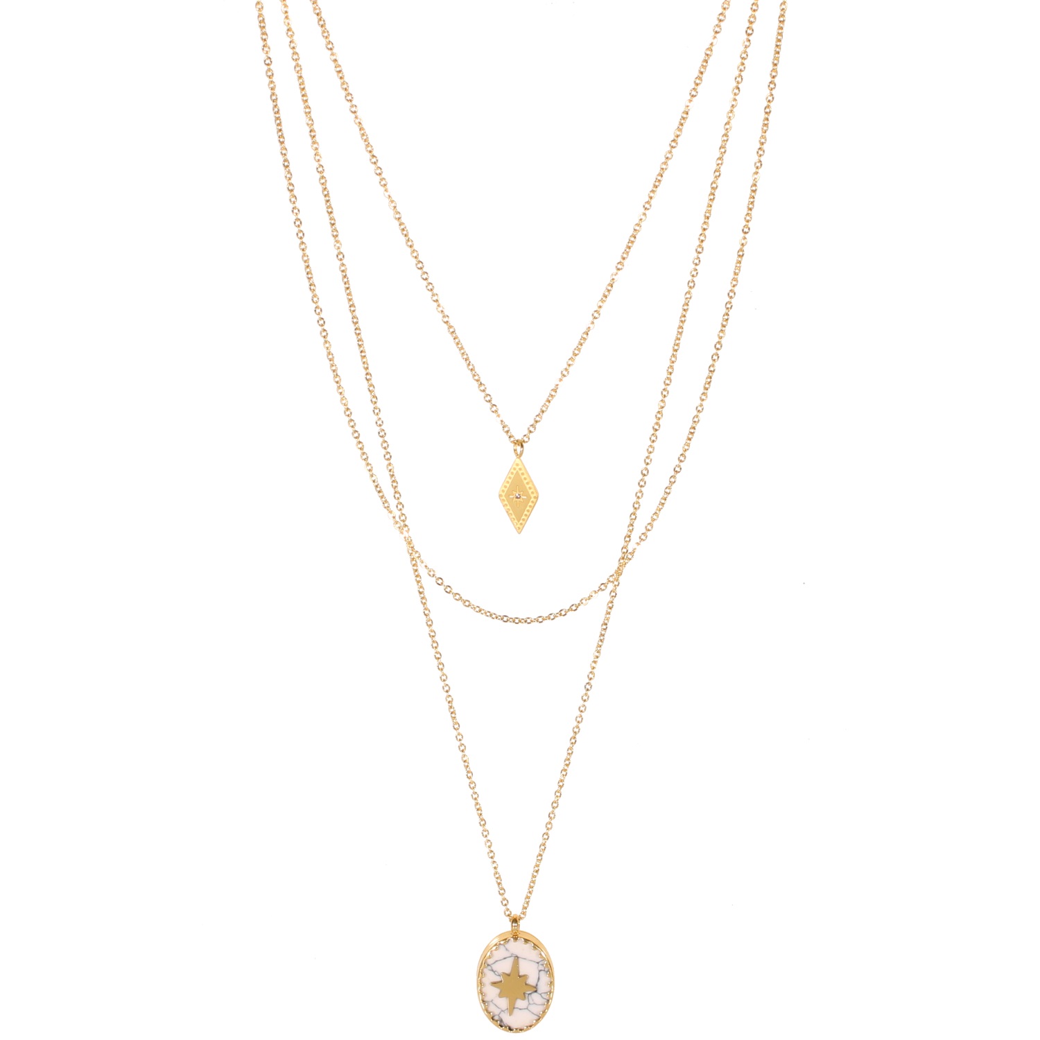 Collier triple rangs composé d'un collier de 38 cm de long avec un pendentif en forme de losange et une étoile comme motif en acier doré surmonté d'un cristal en verre, un collier chaîne de 44 cm de long, ainsi qu'un collier de 54 cm de long en acier doré avec pendentif ovale incrusté d'une pierre de couleur blanche surmonté d'une étoile en acier doré.