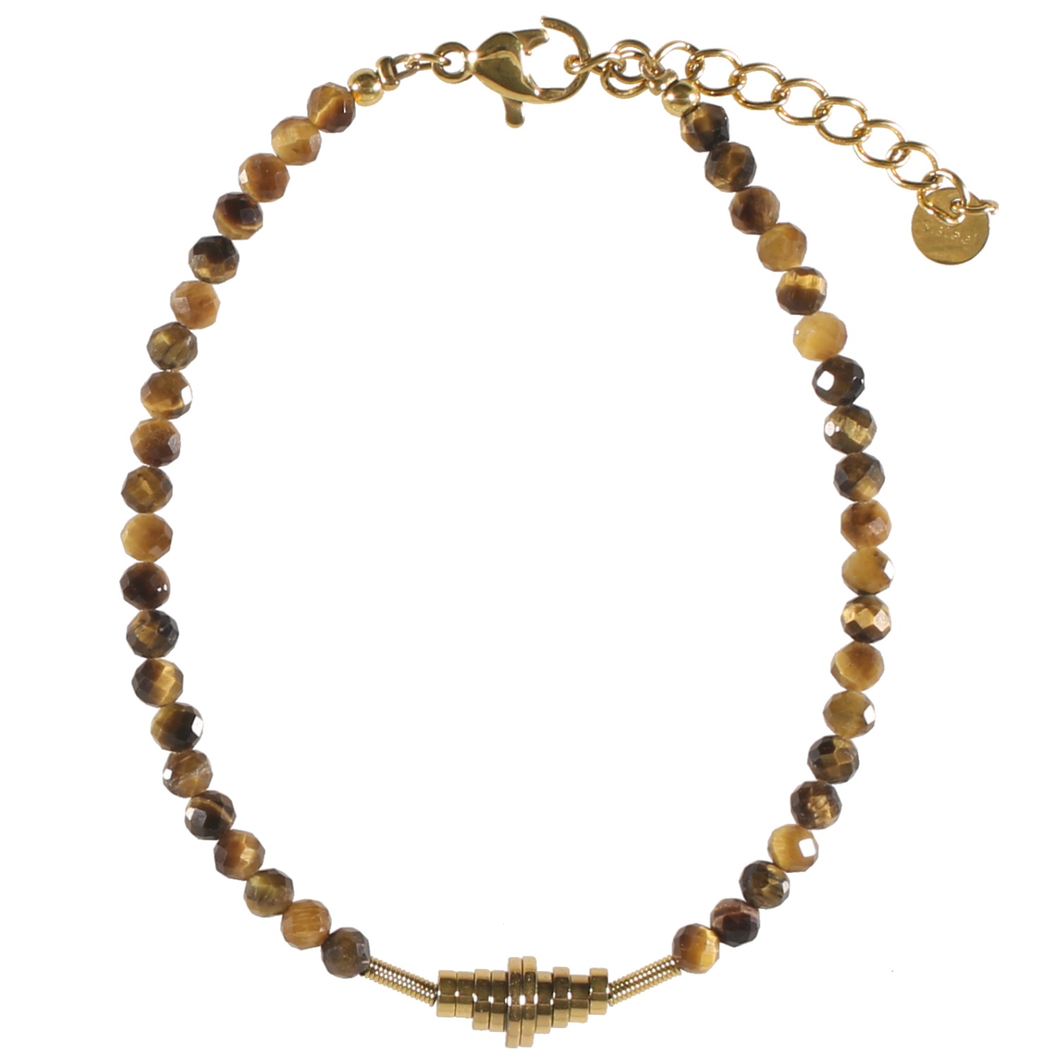 Bracelet avec rondelles cylindriques en acier doré et véritables perles en pierre d'œil de tigre.