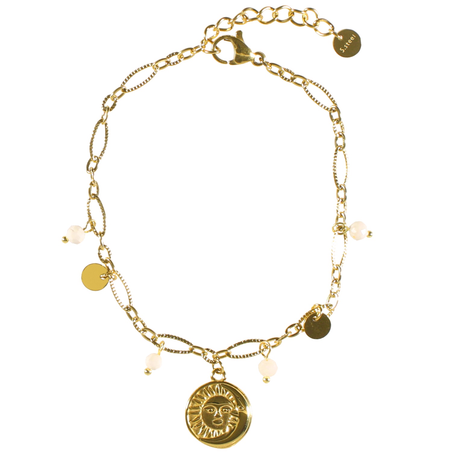 Bracelet composé d'une chaîne avec pampilles rondes et d'une pastille pendante au motif du soleil et d'un croissant de lune avec visage en acier doré et perles de couleur blanche.