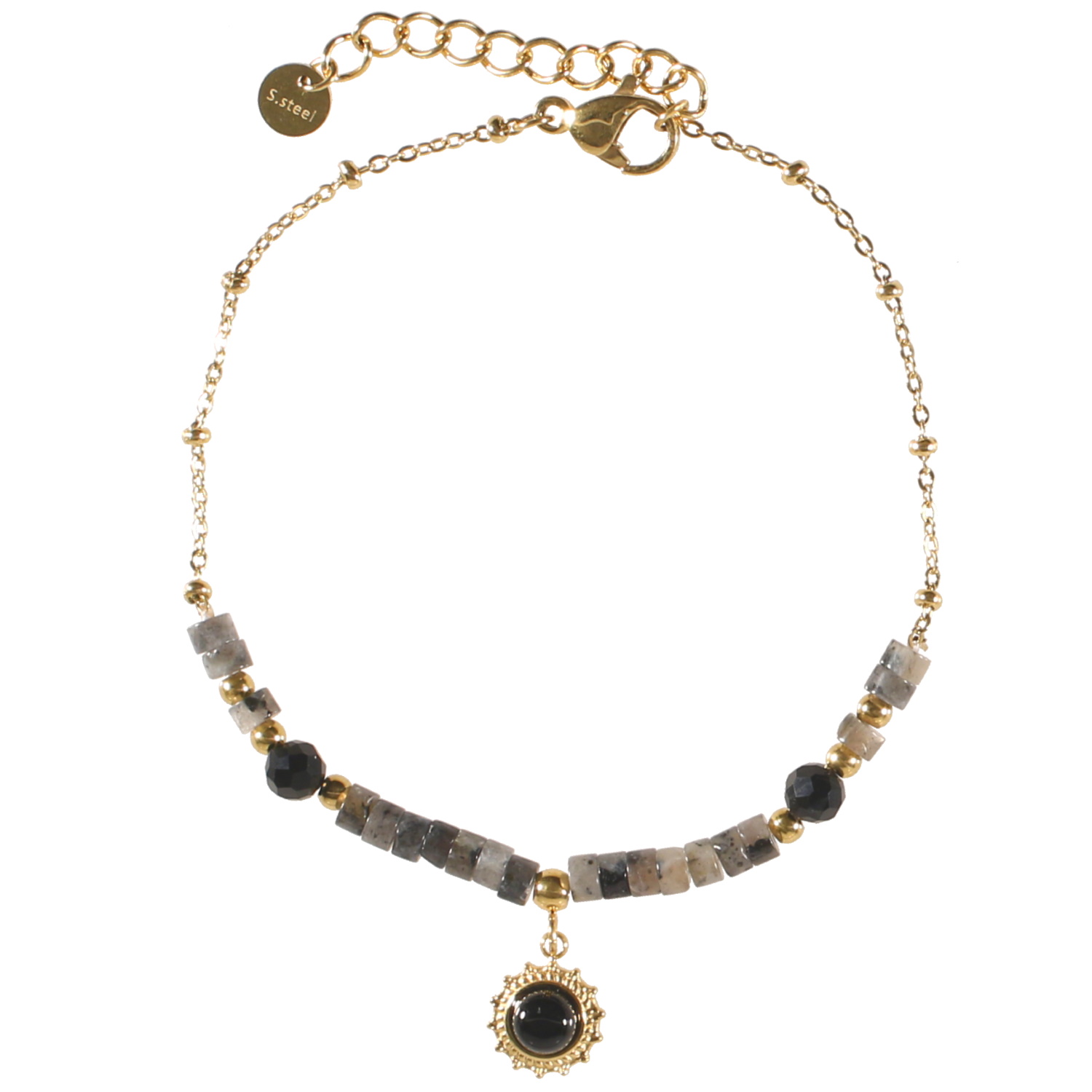 Bracelet composé d'une chaîne en acier doré, perles en pierre naturelle et pendant soleil en acier doré surmonté d'une véritable pierre d'agate noire.