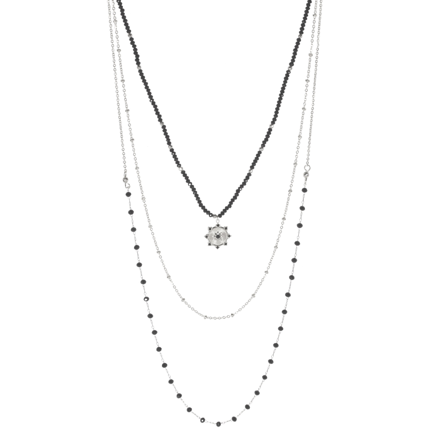 Collier triple rangs composé d'une chaîne de 40 cm de long en acier argenté avec perles de couleur noire et un pendentif au motif d'étoile en acier argenté serti de cristaux noirs, un collier de 50 cm de long en acier argenté, ainsi qu'un collier de 60 cm de long en acier argenté avec perles de couleur noire.