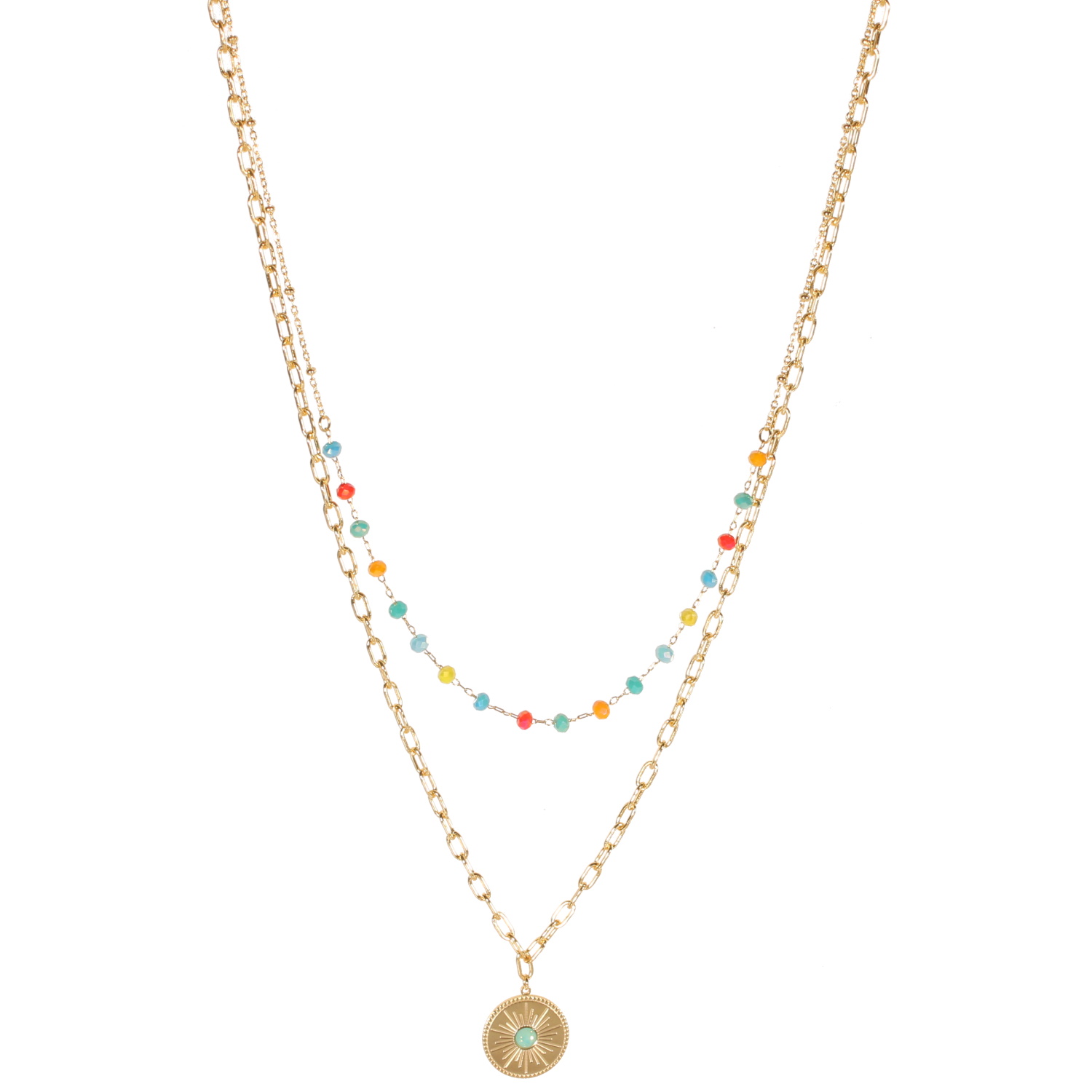 Description Collier double rangs composé d'une chaîne de 38 cm de long en acier doré avec perles multicolores, ainsi qu'une chaîne de 45 cm de long en acier doré et un pendentif rond surmonté d'une pierre de couleur verte. Fermoir mousqueton avec 5 cm de rallonge. Longueur 38+5 cm [Guide des tailles] Matière(s) Acier , Rocaille . L'acier utilisé dans la bijouterie existe sous plusieurs qualités. Nous utilisons principalement la qualité 316L, qualité qui est utilisée en chirurgie. Cet acier est donc inoxydable et reste très résistant. Fermoir Mousqueton À noter Pendentif 16 mm de diamètre Couleur(s) dominante(s) Doré , Multicolore Public Adolescent , Adulte . Genre Femme , Fille . Saison Indémodable . Cliquez sur une matière, un thème, une couleur ou une collection pour voir tous les articles associés.