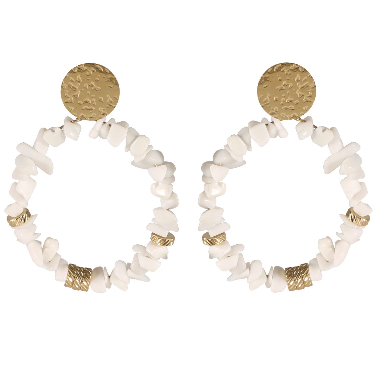 Boucles d'oreilles pendantes composées d'une pastille ronde martelée en acier doré et d'un cercle surmonté de perles cylindriques en acier doré et de perles en véritable pierre de jade blanc. Pendantes Perle Rond Turquoise  Adolescent Adulte Femme Fille Indémodable