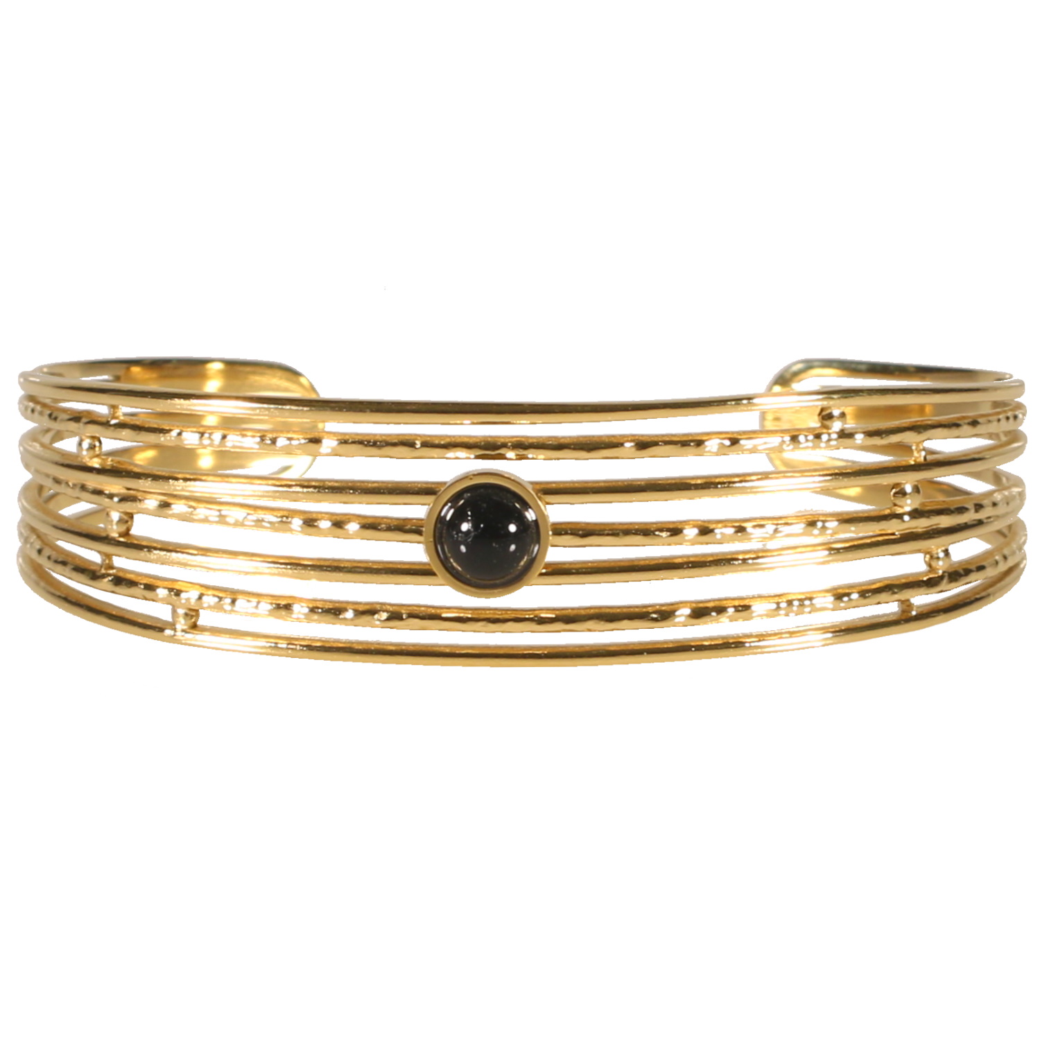 Bracelet jonc ouvert en acier doré surmonté d'une véritable pierre d'onyx de forme ronde sertie clos.