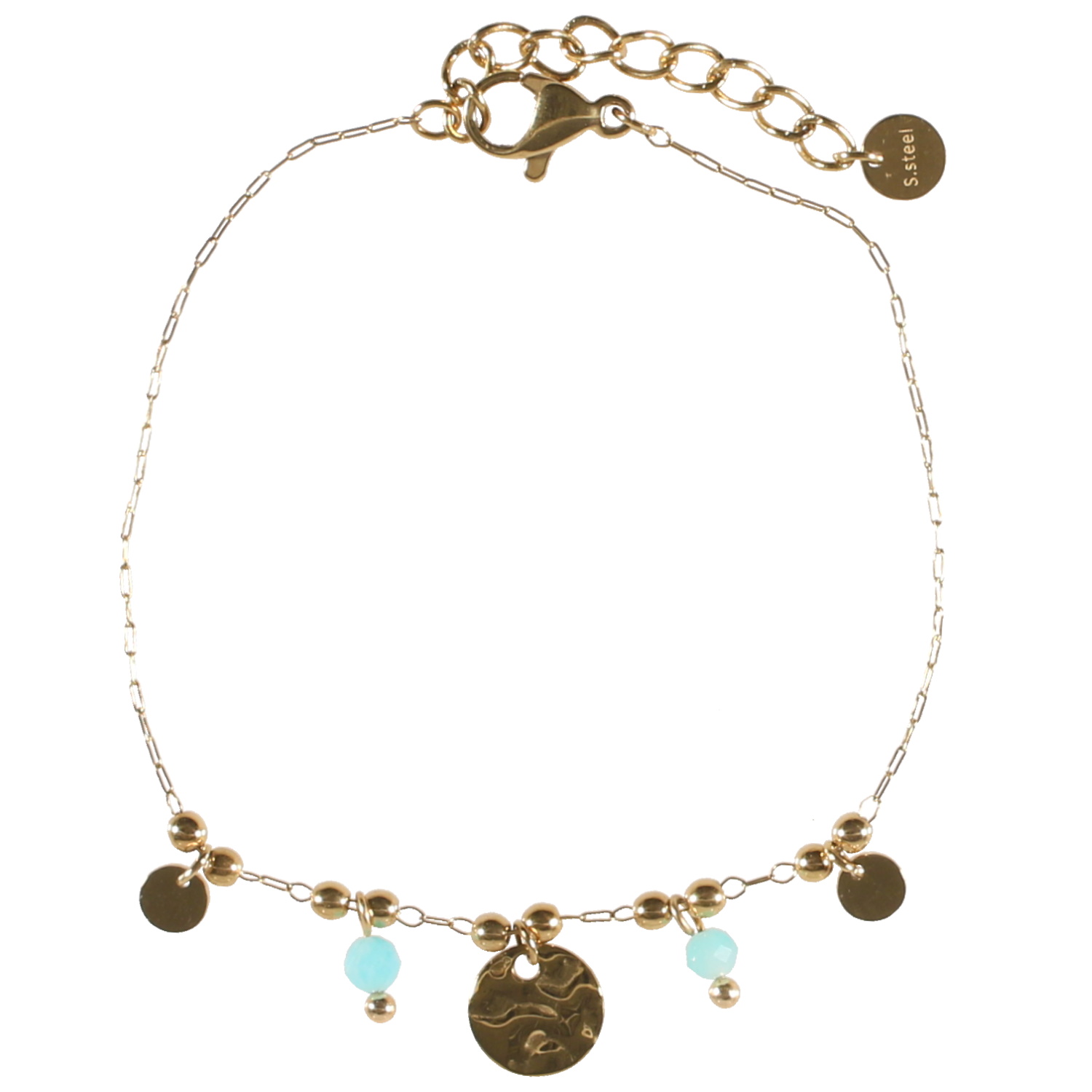 Description Bracelet composé d'une chaîne avec pampilles pastilles rondes et martelée en acier doré et de perles en véritable pierre d'amazonite. Fermoir mousqueton avec 3 cm de rallonge. Cliquez sur une matière, un thème, une couleur ou une collection pour voir tous les articles associés.
