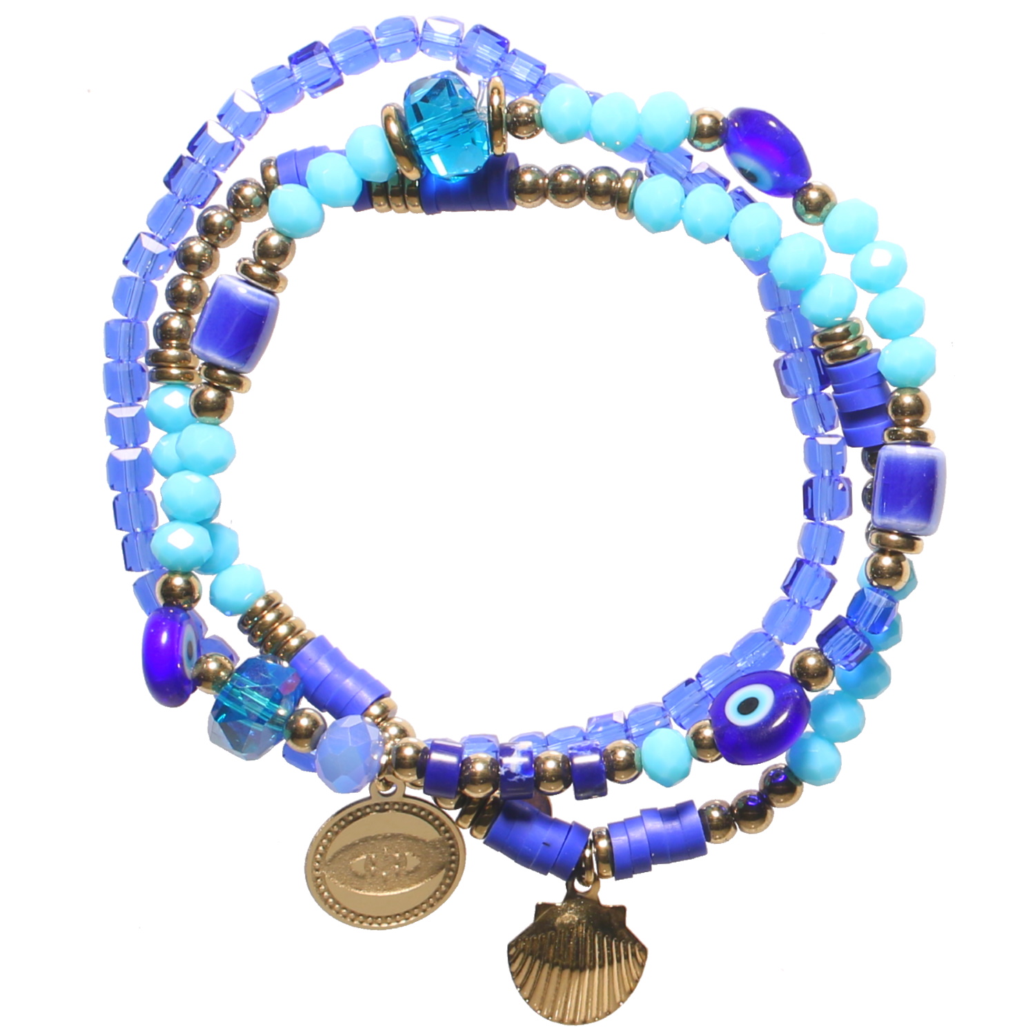 Lot de 3 bracelets élastiques composés de perles en acier doré, de perles de couleur bleue, de perles cylindriques en caoutchouc de couleur bleue, de perles œil de Turquie, d'une breloque coquillage et d'une pastille ronde œil de Turquie.