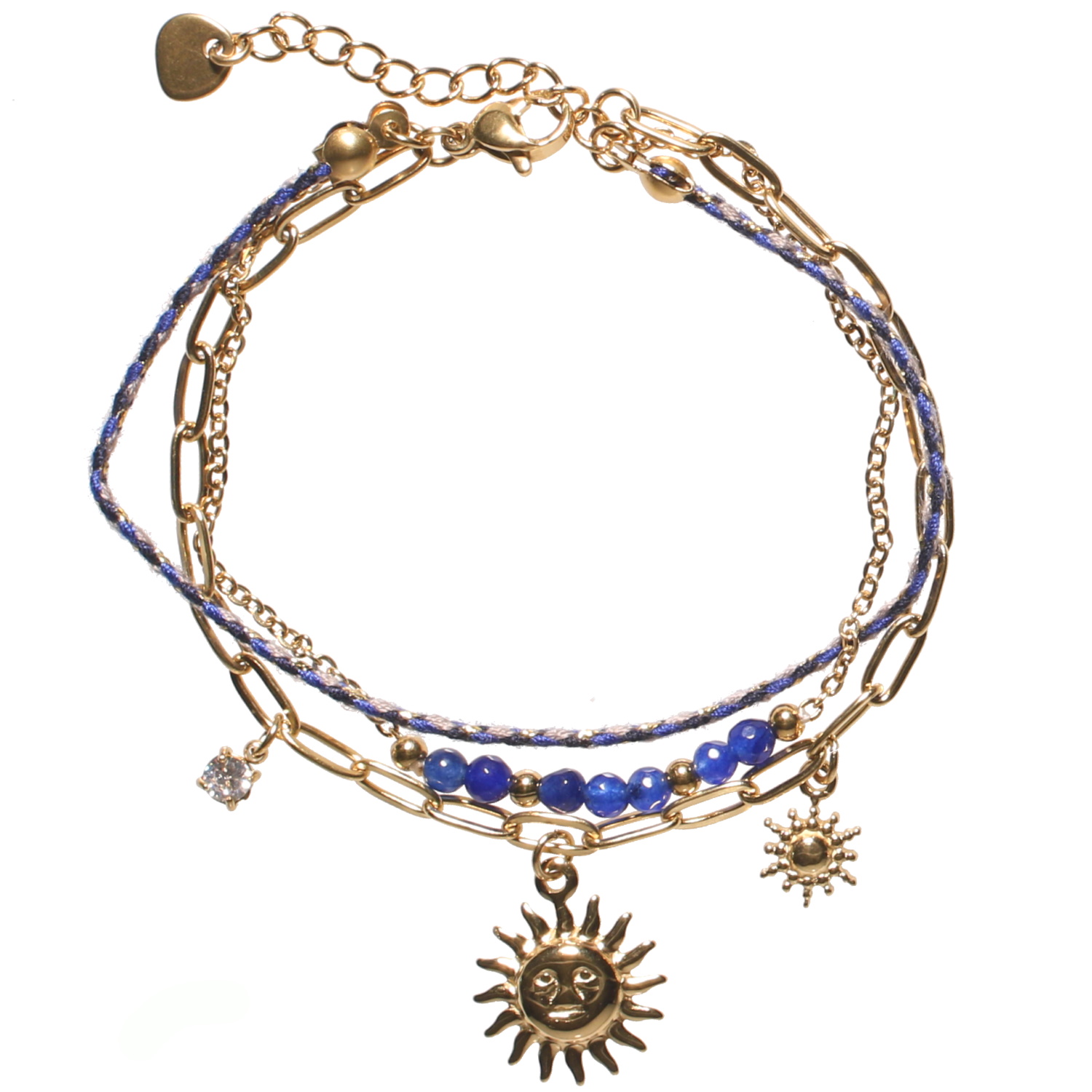 Bracelet triple rangs composé d'une chaîne en acier doré avec des perles de couleur bleue, d'un cordon de couleur bleu, gris et doré et d'une chaîne avec des pendants en forme de soleil en acier doré et un pendant serti griffes d'un strass.