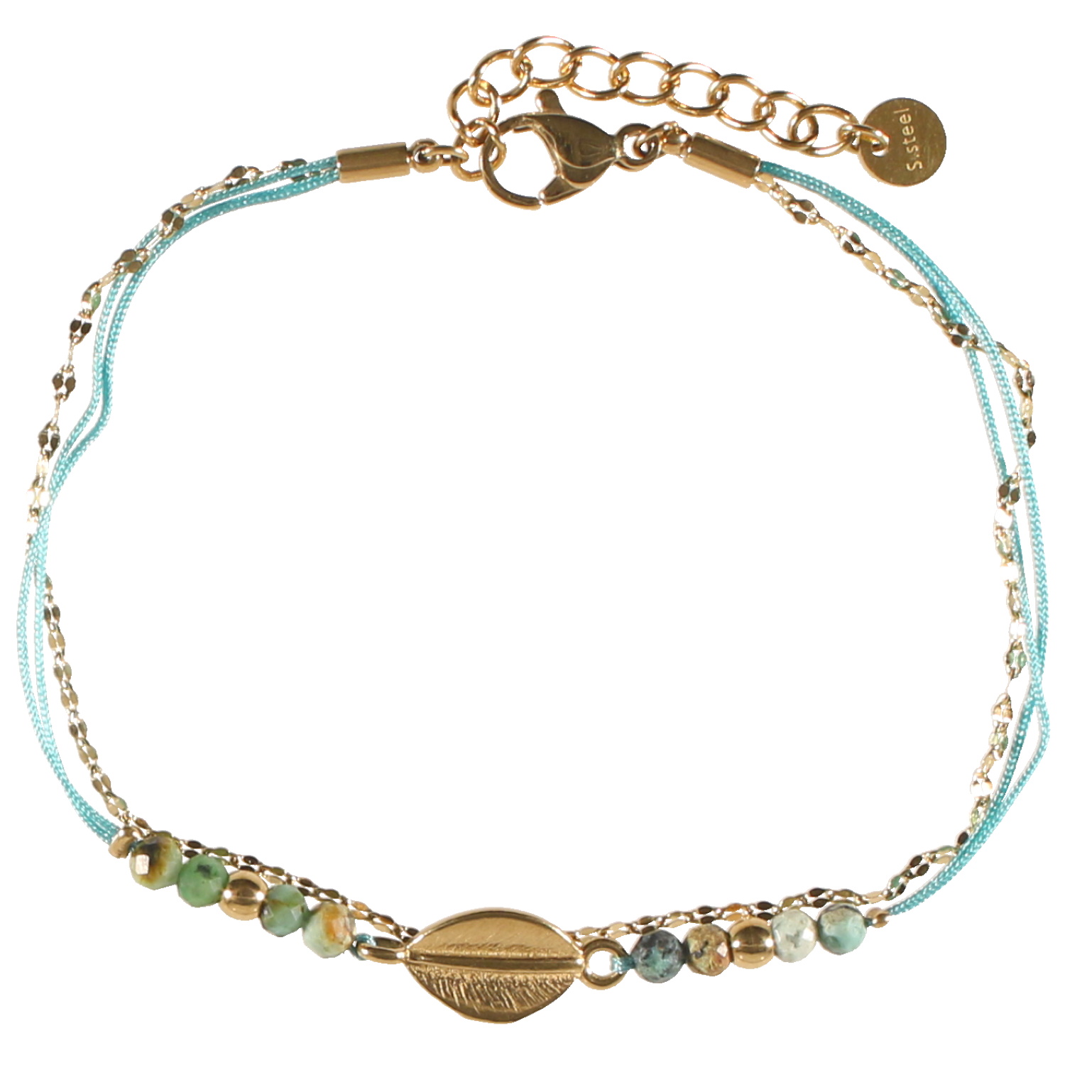 Bracelet double rangs composé d'une chaîne en acier doré, un cordon de coton avec perles en pierre naturelle et une feuille en acier doré.