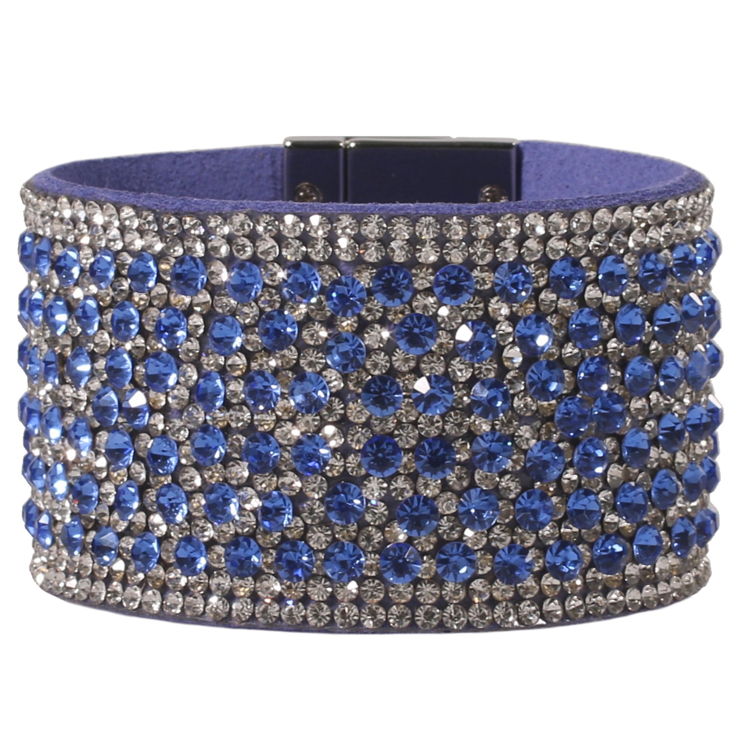 Bracelet manchette fantaisie en métal argenté, suédine et cristaux synthétiques.