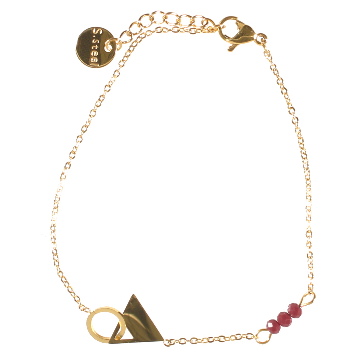 Description Bracelet avec cercle et triangle en acier doré et pierres de couleur rouge. Longueur 16.5+2 cm [Guide des tailles] Largeur 10 mm Matière(s) Acier , Rocaille . L'acier utilisé dans la bijouterie existe sous plusieurs qualités. Nous utilisons principalement la qualité 316L, qualité qui est utilisée en chirurgie. Cet acier est donc inoxydable et reste très résistant. Fermoir Mousqueton Couleur(s) dominante(s) Doré , Rouge Public Adolescent , Adulte . Genre Femme , Fille . Saison Indémodable . Cliquez sur une matière, un thème, une couleur ou une collection pour voir tous les articles associés.