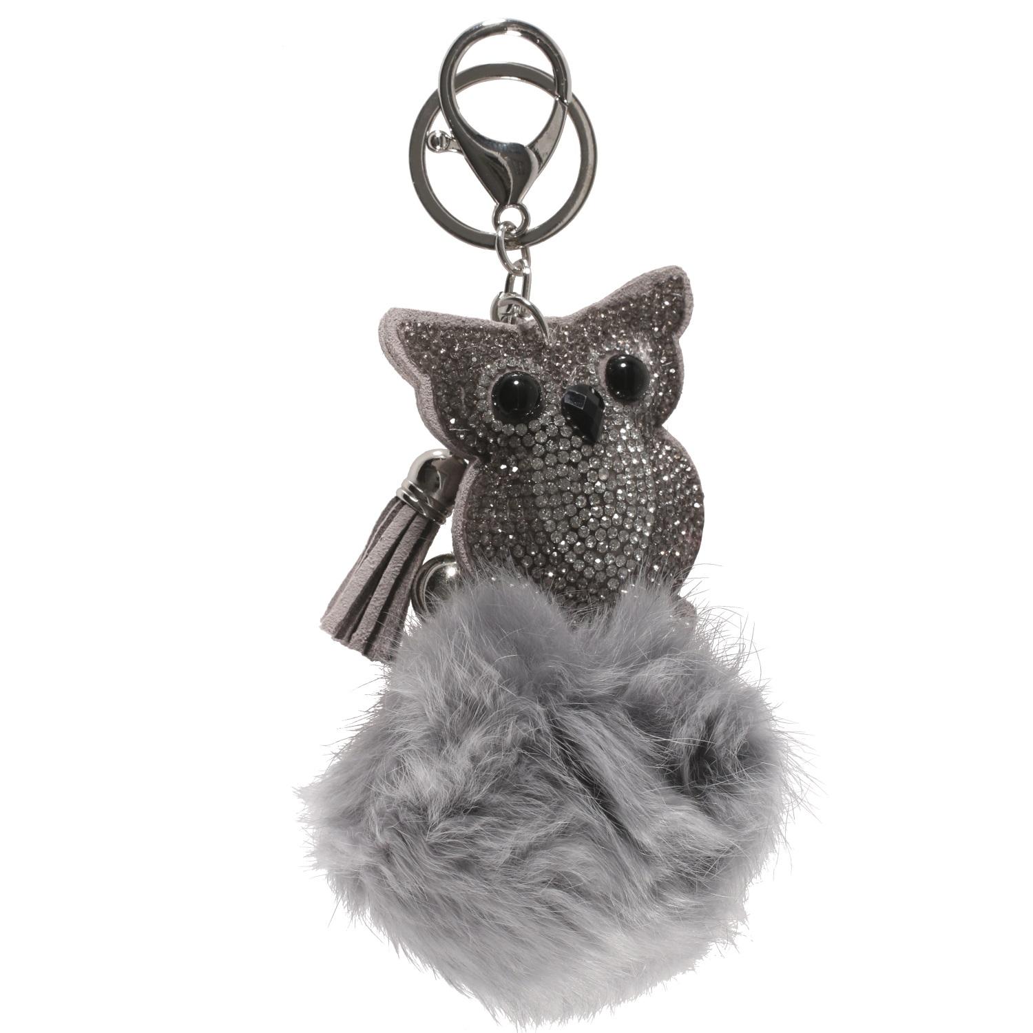 Porte-clés fantaisie avec hibou en suédine, pierres de couleur noire et strass couleur cristal et pompon en textile.