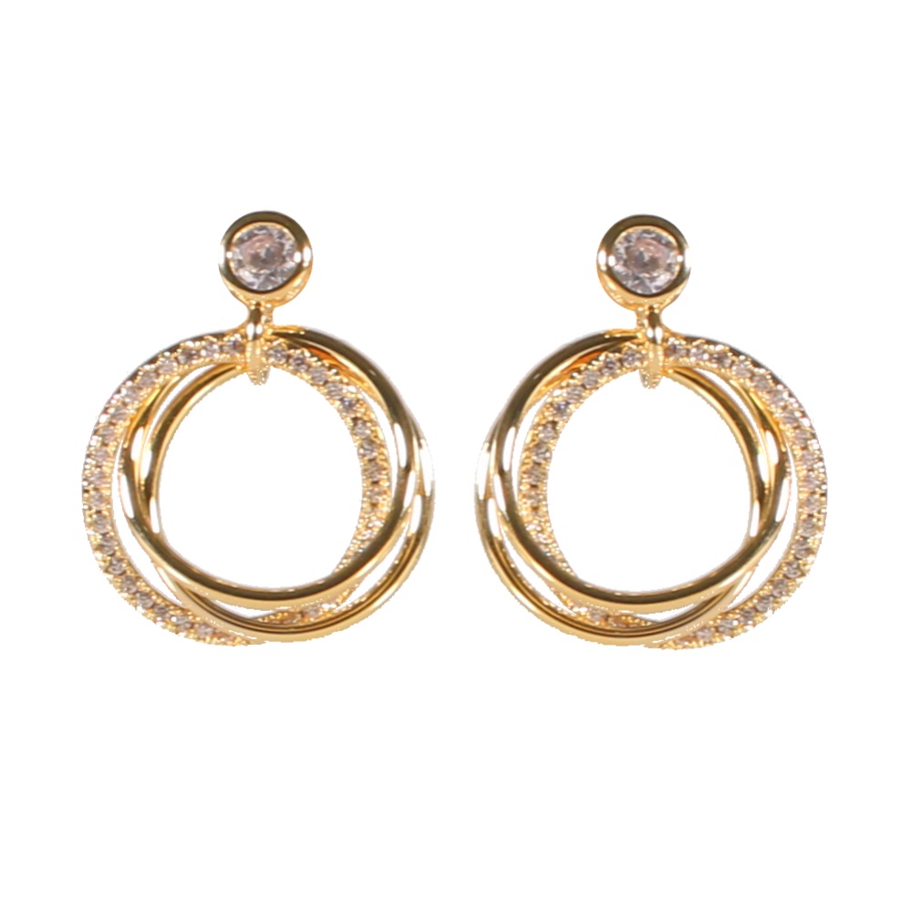 Boucles d'oreilles pendantes avec trois cercles amovibles en métal doré et oxydes de zirconium.