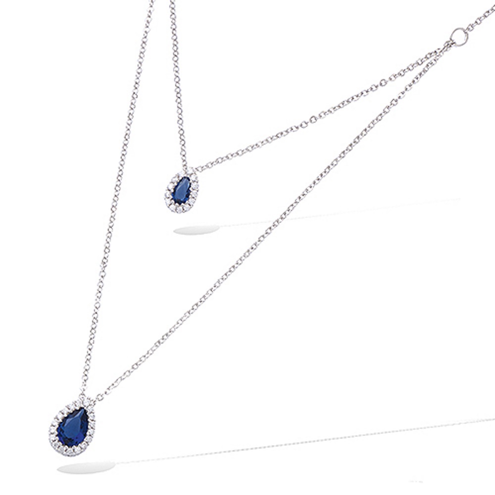 Collier double rangs en argent 925/000 rhodié et pendentifs goutte en verre de couleur saphir et oxydes de zirconium.