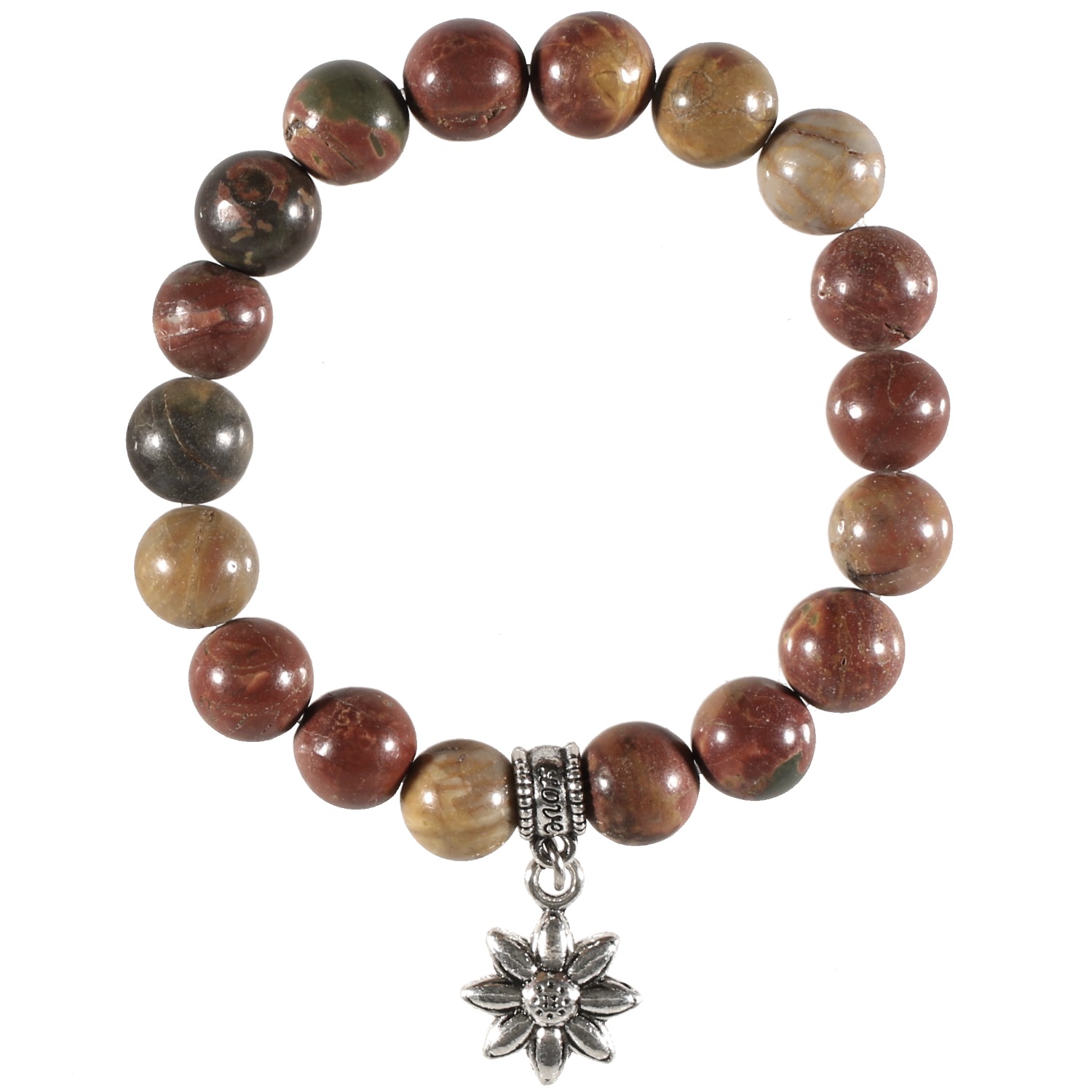 Bracelet élastique avec fleur en métal argenté et boules en pierre fluorite.