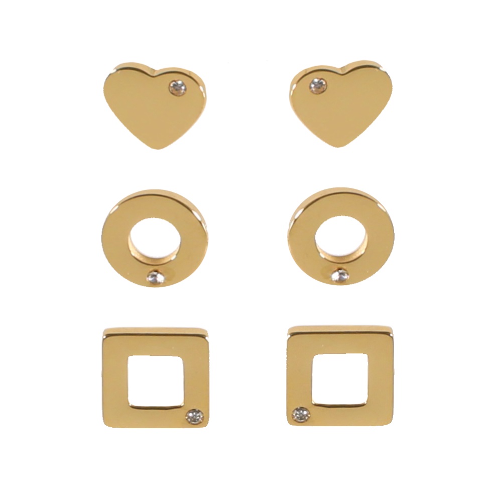 Description lot de 3 paires de boucles d'oreilles puces cercles, carrés et cœurs en acier doré et cristaux en verre. Largeur 9 mm Matière(s) Acier , Verre . L'acier utilisé dans la bijouterie existe sous plusieurs qualités. Nous utilisons principalement la qualité 316L, qualité qui est utilisée en chirurgie. Cet acier est donc inoxydable et reste très résistant. Fermoir Tiges poussettes Couleur(s) dominante(s) Doré Public Adolescent , Adulte . Genre Femme , Fille . Saison Indémodable . Thème(s) Amour . Cliquez sur une matière, un thème, une couleur ou une collection pour voir tous les articles associés.