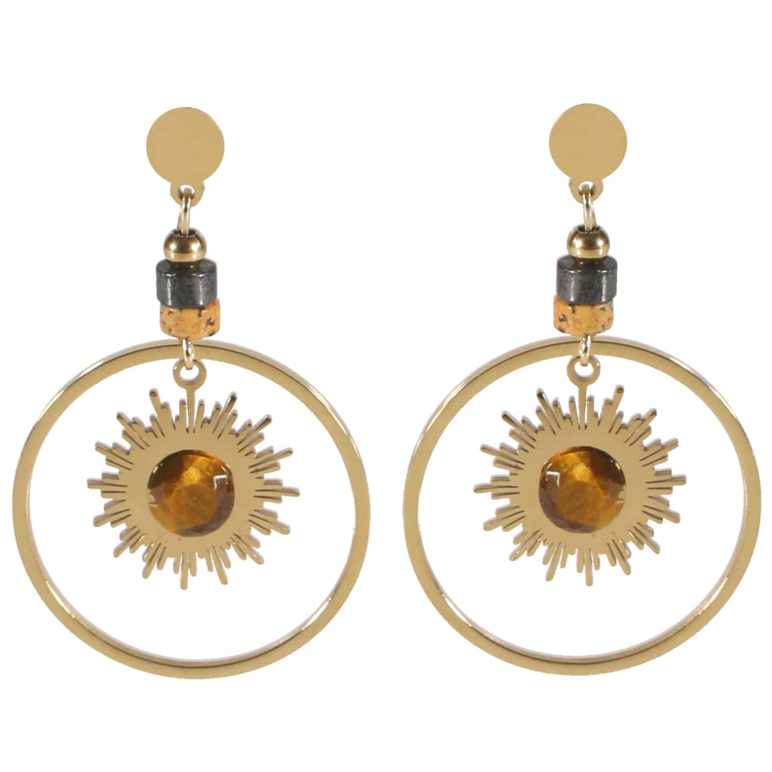 Boucles d'oreilles pendantes avec cercles et soleil en acier doré et pierres œil de Tigre.