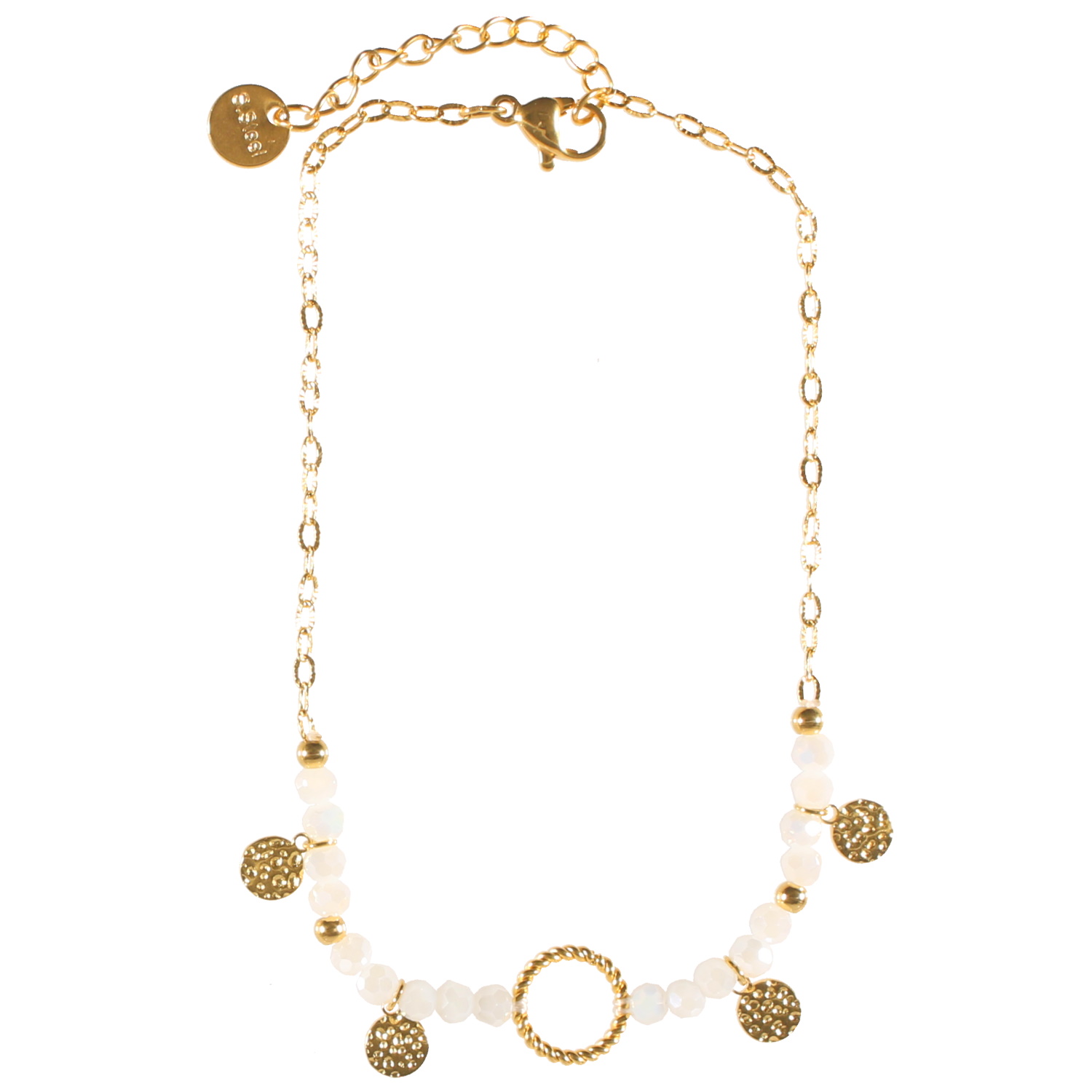Description Bracelet chaîne de cheville composé d'une chaîne avec quatre pastilles martelées et d'un cercle en acier doré et des perles de couleur blanche. Fermoir mousqueton avec 3 cm de rallonge. Longueur 23+3 cm [Guide des tailles] Largeur 10 mm Matière(s) Acier , Rocaille . L'acier utilisé dans la bijouterie existe sous plusieurs qualités. Nous utilisons principalement la qualité 316L, qualité qui est utilisée en chirurgie. Cet acier est donc inoxydable et reste très résistant. Fermoir Mousqueton Couleur(s) dominante(s) Blanc , Doré Public Adolescent , Adulte . Genre Femme , Fille . Saison Eté . Cliquez sur une matière, un thème, une couleur ou une collection pour voir tous les articles associés.