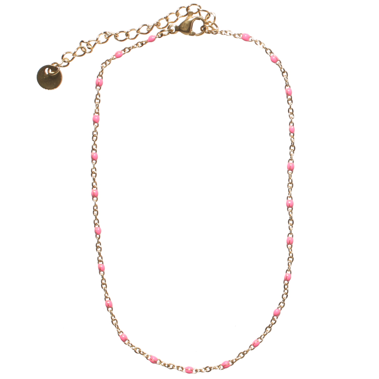 Bracelet chaîne de cheville composé d'une chaîne en acier doré avec perles de couleur rose.