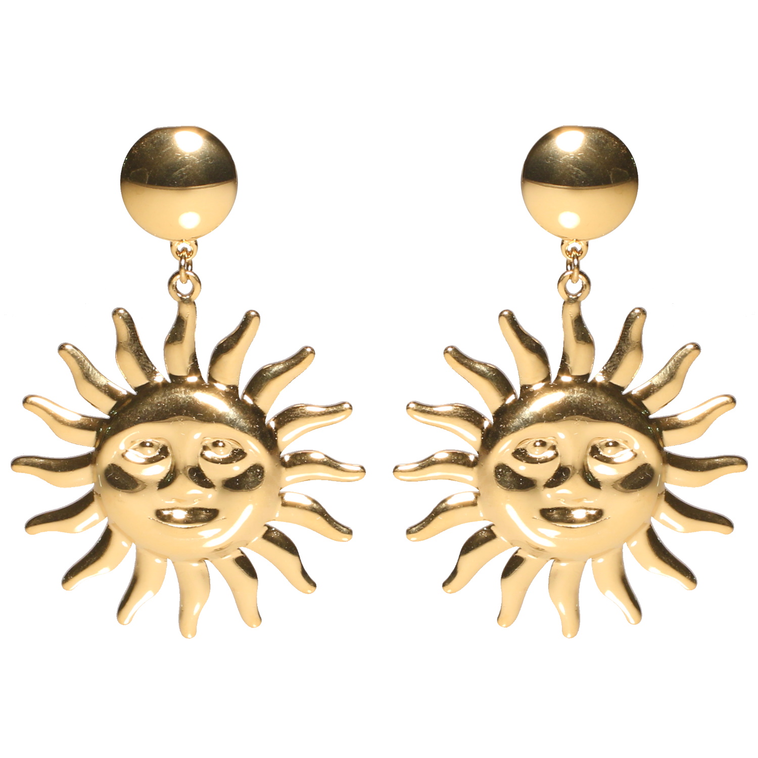 Description Boucles d'oreilles pendantes composées d'une pastille ronde et d'un soleil avec visage en acier doré. Largeur 40 mm Hauteur 58 mm Matière(s) Acier . L'acier utilisé dans la bijouterie existe sous plusieurs qualités. Nous utilisons principalement la qualité 316L, qualité qui est utilisée en chirurgie. Cet acier est donc inoxydable et reste très résistant. Fermoir Tiges poussettes Couleur(s) dominante(s) Doré Public Adolescent , Adulte . Genre Femme , Fille . Saison Indémodable . Thème(s) Nature , Personnage . Cliquez sur une matière, un thème, une couleur ou une collection pour voir tous les articles associés.