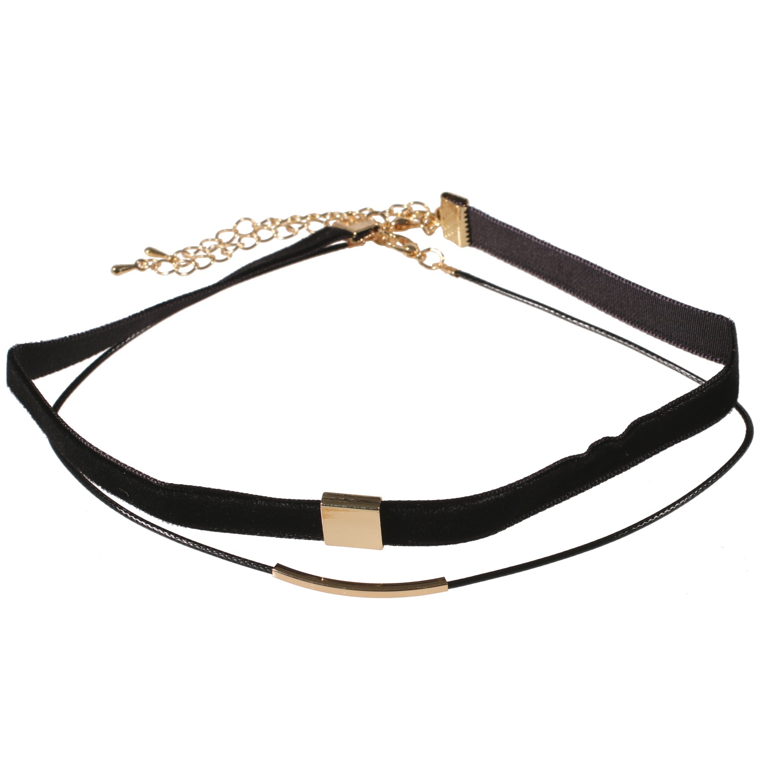 Lot de 2 colliers ras de cou fantaisie en métal doré, coton et velours.