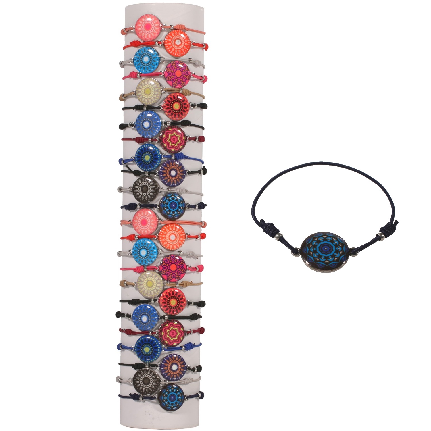Bracelet fantaisie en métal argenté, coton et émail.