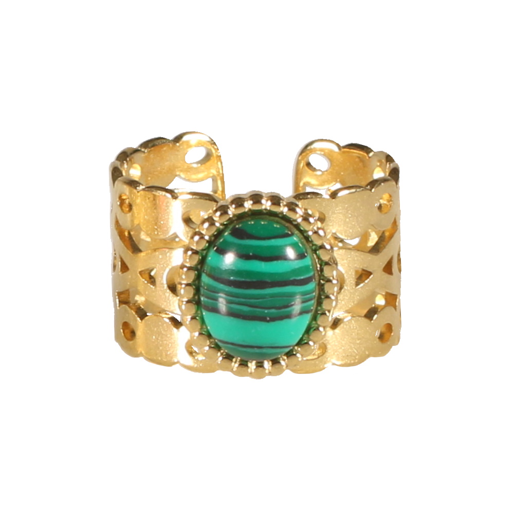Description Bague aux motifs ajourés en acier doré surmontée d'une pierre d'imitation malachite sertie clos de forme ovale. Taille ajustable. Largeur 14 mm Matière(s) Acier , Rocaille . L'acier utilisé dans la bijouterie existe sous plusieurs qualités. Nous utilisons principalement la qualité 316L, qualité qui est utilisée en chirurgie. Cet acier est donc inoxydable et reste très résistant. Fermoir Aucun Couleur(s) dominante(s) Doré , Vert Public Adolescent , Adulte . Genre Femme , Fille . Saison Indémodable . Cliquez sur une matière, un thème, une couleur ou une collection pour voir tous les articles associés.