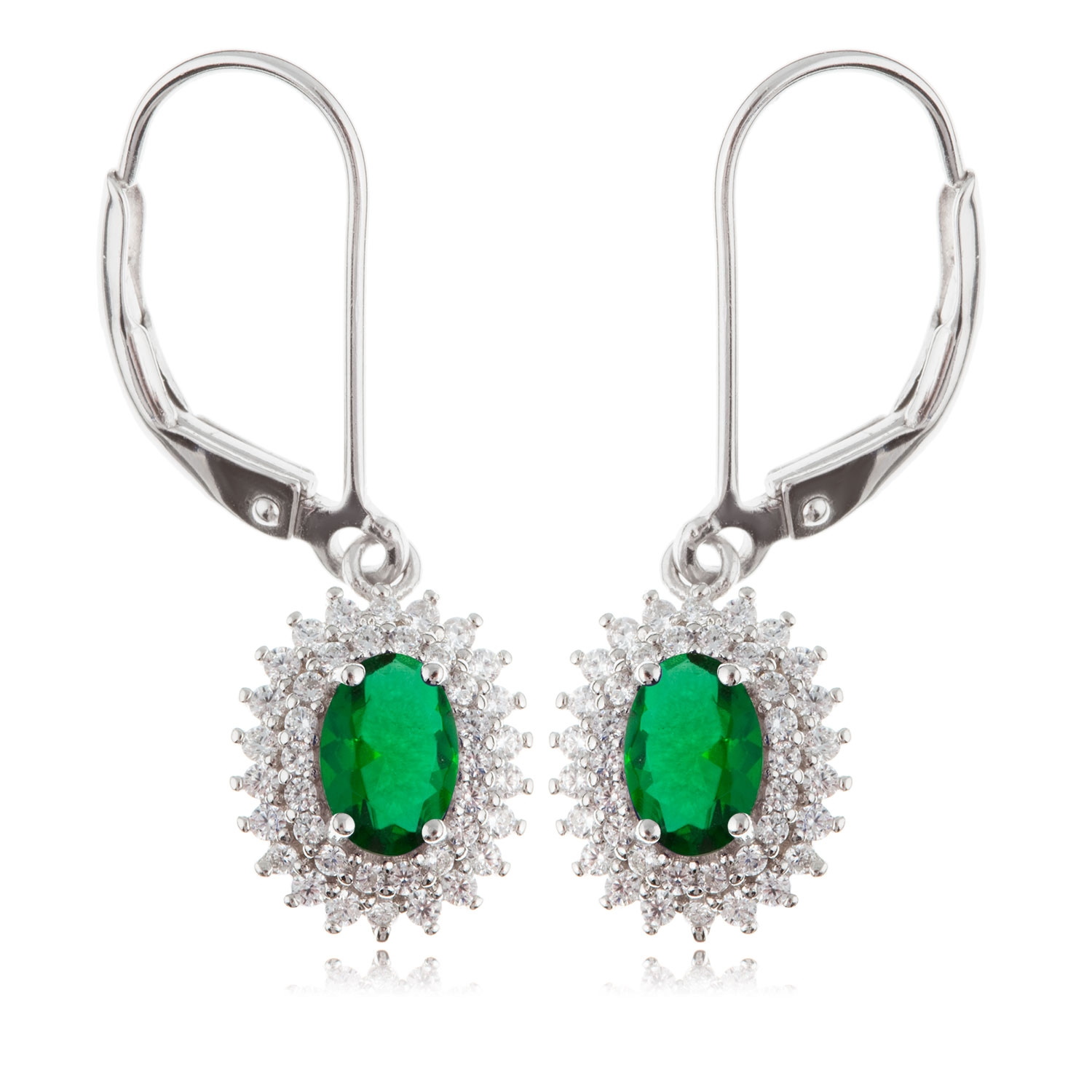 Boucles d'oreilles dormeuses en argent 925/000 rhodié avec un pendant ovale pavé d'oxydes de zirconium blancs et surmonté d'une pierre de couleur verte sertie 4 griffes.